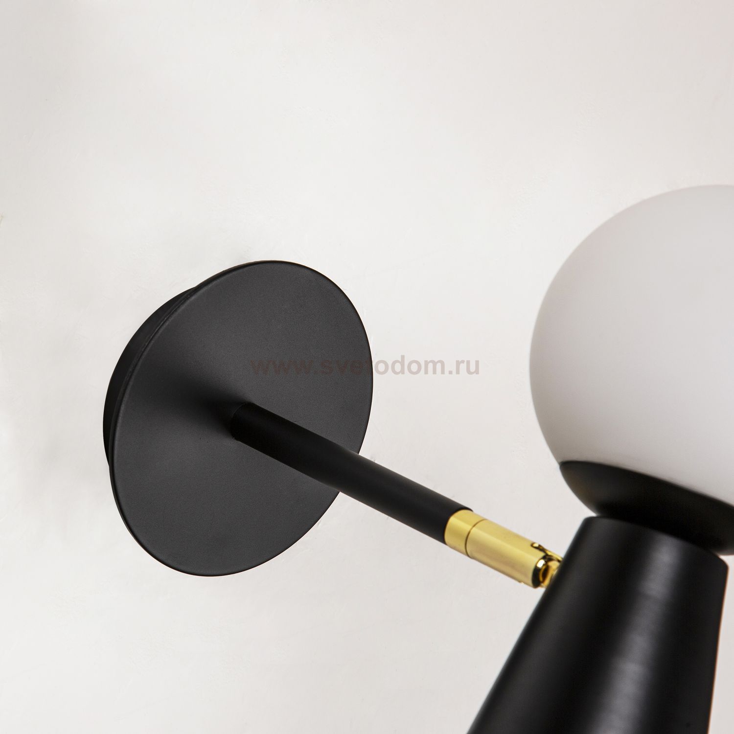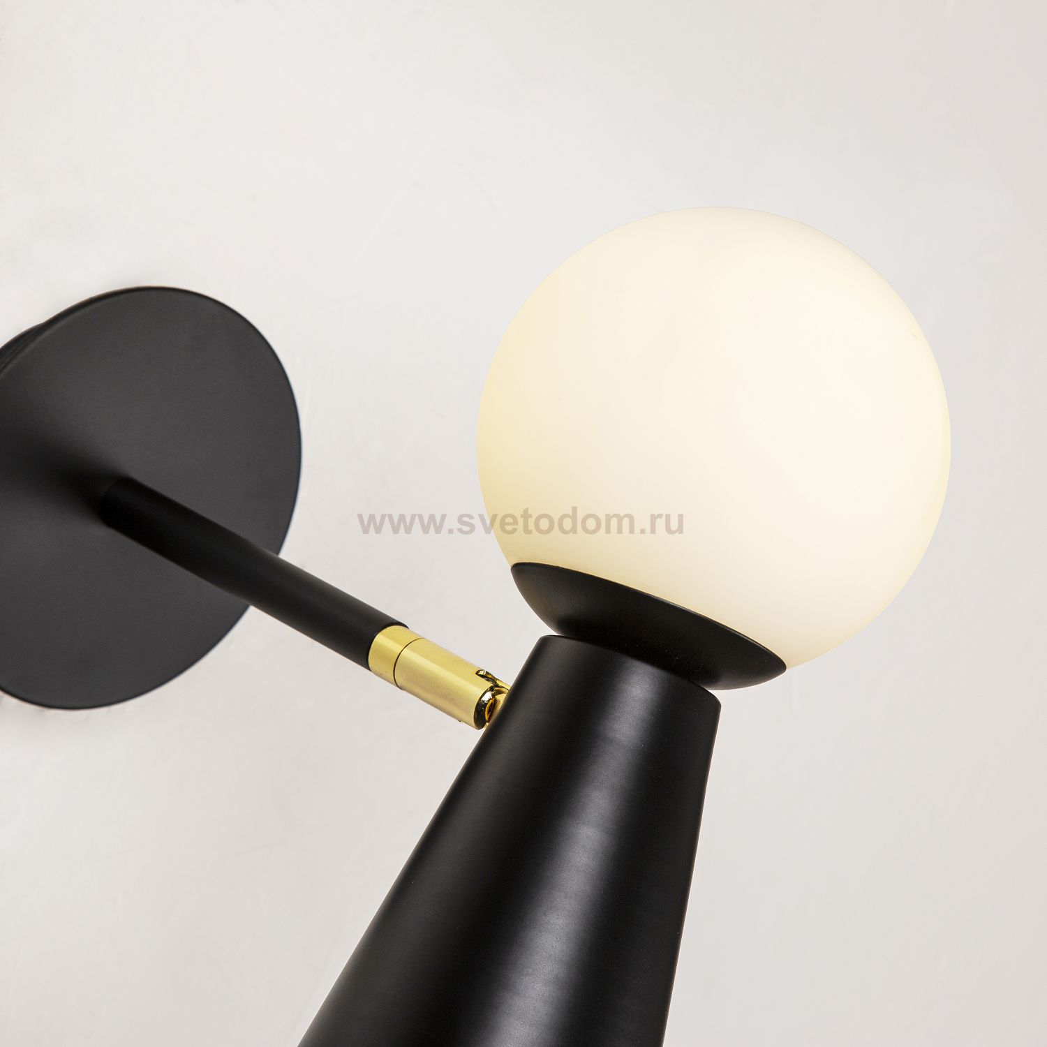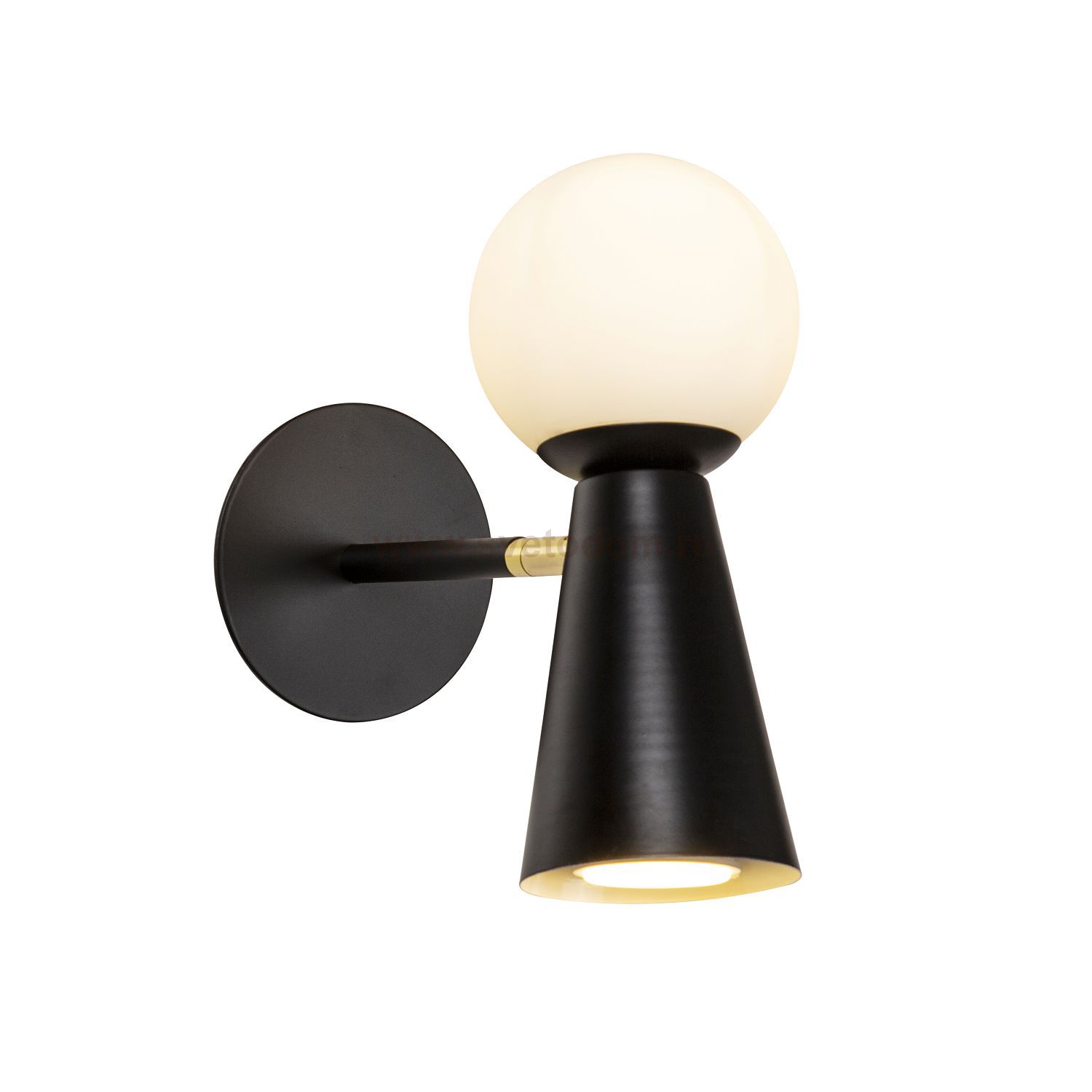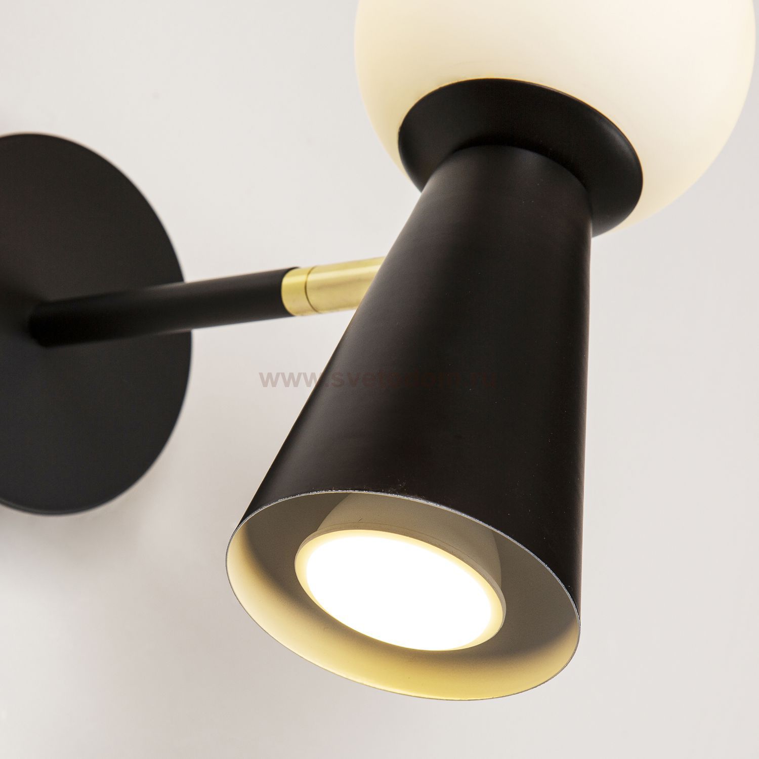 каркас черного цвета, поворотный плафон с двумя источниками света - стеклянный выдувной матовый шар с лампой G9 и металлический конус с лампой GU10, л Серия