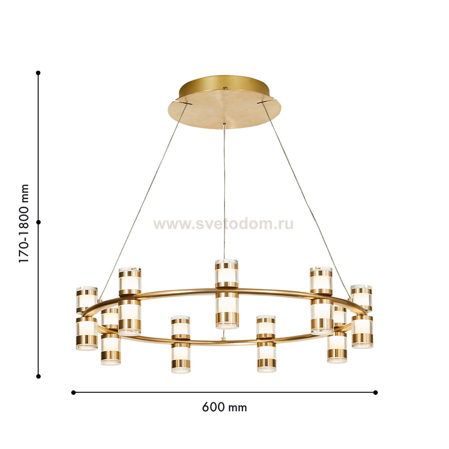 Подвесная люстра в золотом цвете, диаметром 60 см оснащена двусторонним многослойным стеклянным плафоном с светящимся цилиндром внутри и золотыми деко Декор