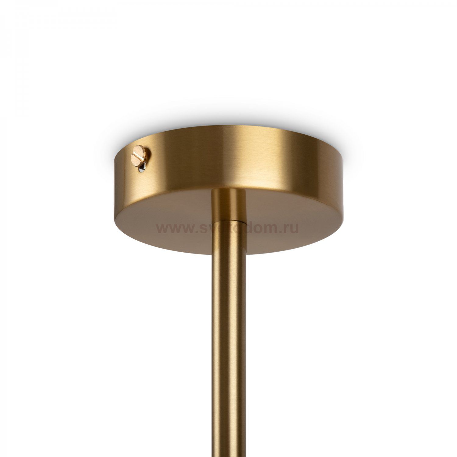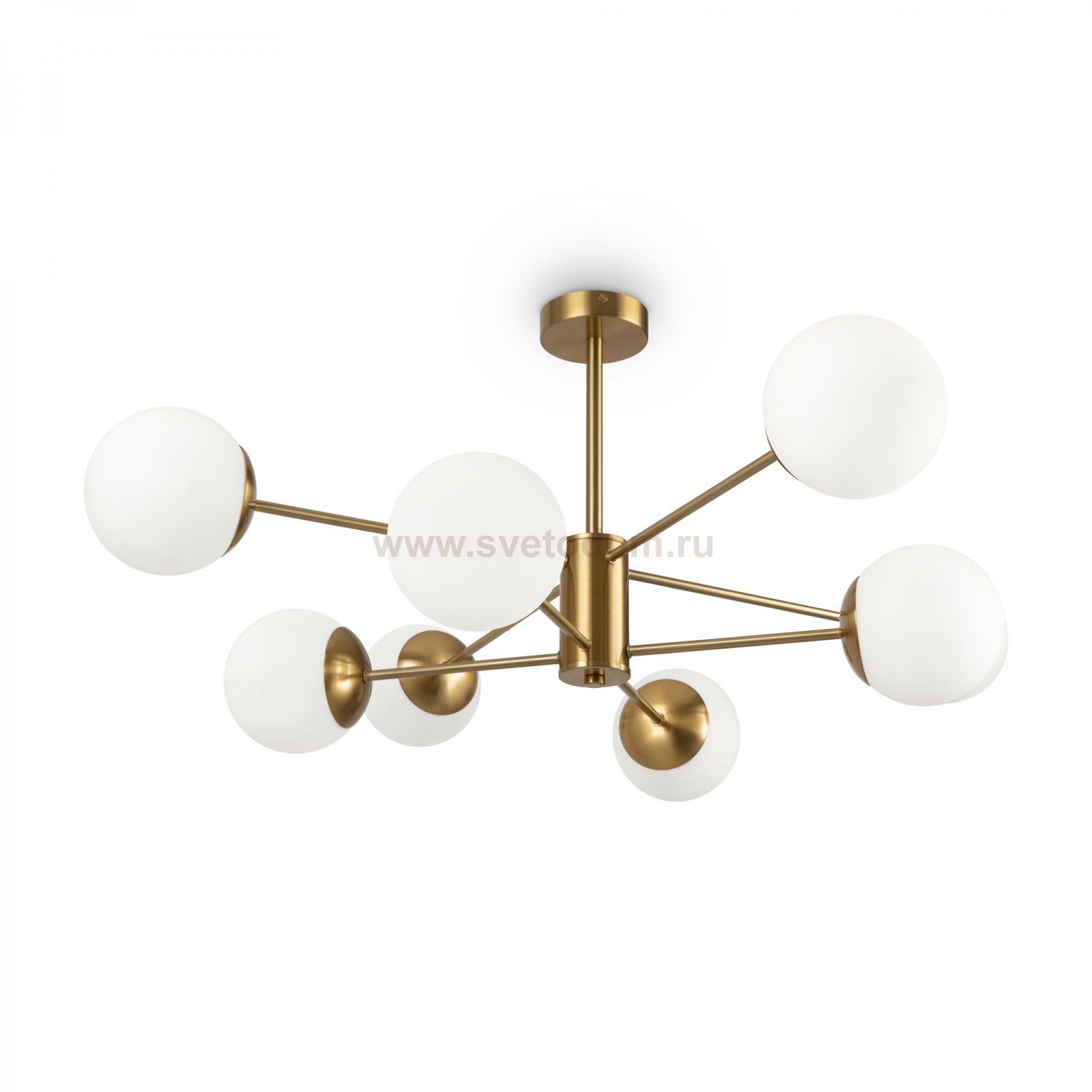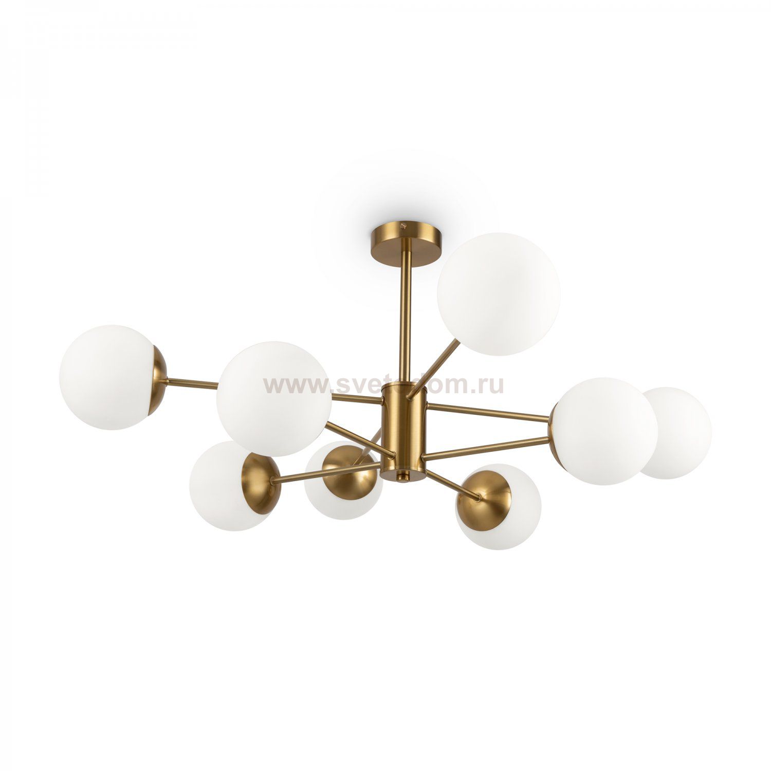 Материал арматуры – металл, цвет – латунь. Плафоны из матового белого стекла. Декор плафонов – металлический кант в тон арматуре. Оригинальная геометрия в дизайне создает динамичный образ. Источник света – лампа с цоколем Е27.