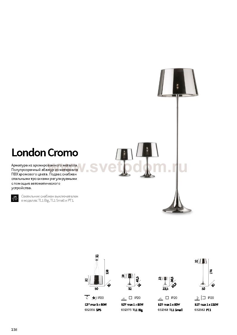 238 Отзывы Ideal Lux LONDON TL1 BIG CROMOПока нет отзывов об этом товаре, напишите и он обязательно появится после модерации! Оставить свой отзывПохожие товары Другие товары магазина Фото