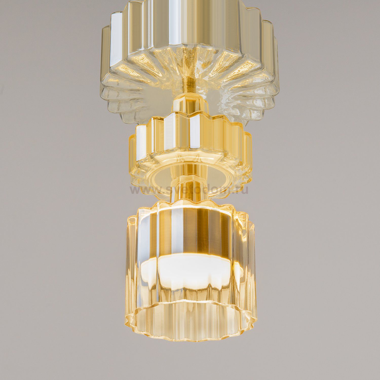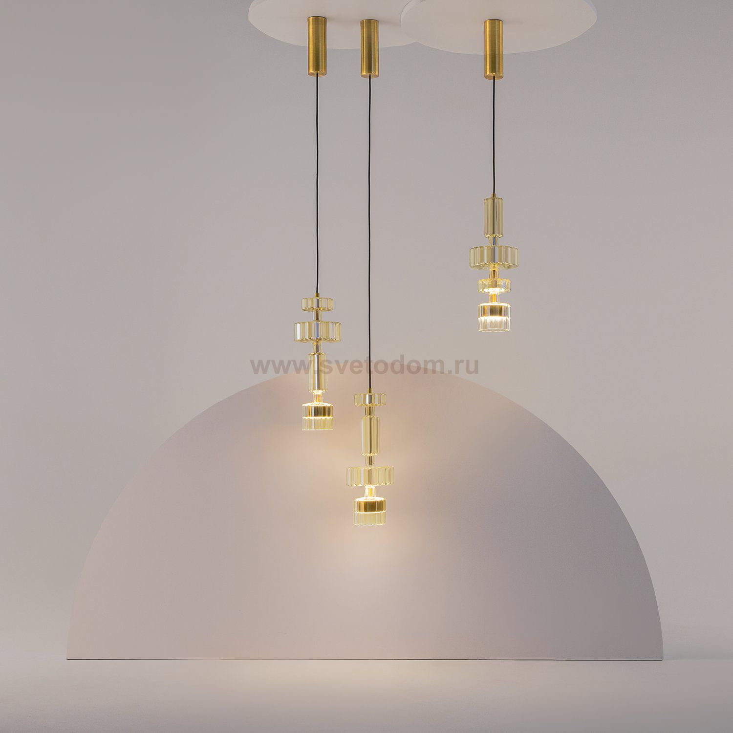 Арматура в цвете латуни. Плафоны и декоративные элементы стеклянные, цвет коньячный. Источник света: LED-светодиод. Цветовая температура — 3000К, угол рассеивания — 120 градусов. Регулируемый по длине провод 3 метра — для использования в помещениях с высокими потолками. 3 варианта дизайна плафонов для составления композиций из одинарных светильников. Магнитные потолочные чаши без креплений сбоку и держателя провода.