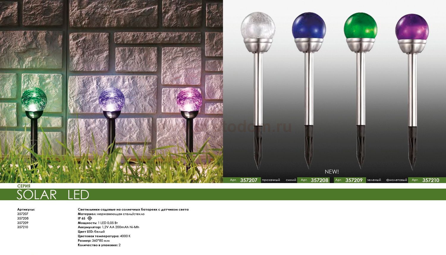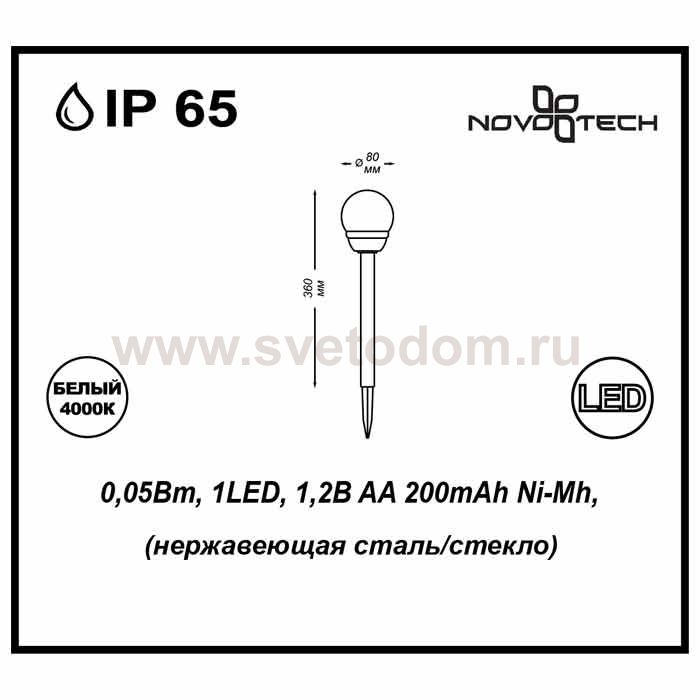 Светильник садовый на солнечных батареях с датчиком света модели Novotech 357207 из серии SOLAR отличается следующим качеством: Корпус светильника сделан из нержавеющей стали. Её основное свойство - большой период эксплуатации. Сталь по праву можно считать "вечным" материалом. Так же преимуществами являются устойчивость к химическим, атмосферным и механическим воздействиям и эстетичный внешний вид. Благодаря зеркальной полировке, обеспечивается высокая стойкость металла к коррозии. Рассеиватель – пластик. Этот материал имеет высокие эксплуатационные показатели, что объясняется его повышенной стойкостью к механическим повреждениям и защищенностью от факторов внешней среды. Безопасность (отсутстствие внешних проводов), простота в установке и многократное перемещение (по необходимости), экологичность, долговечность, прочность, экономичность, эффектность (отличное дополнение любого дома или участка.) Срок службы светодиодов до 30000 часов. Время заряда 8 - 10 часов. Время автономной работы - 6 часов. Диапазон рабочих температур от -10 до +50 градусов Цельсия.