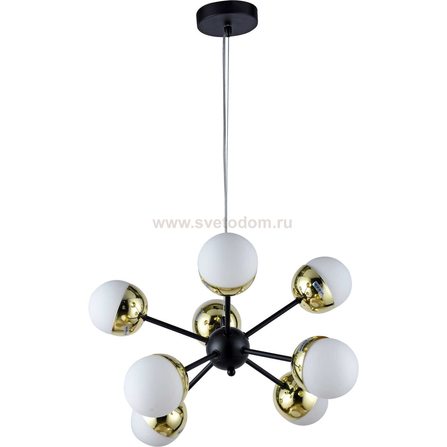 Люстра потолочная на штанге 2032/02/08P Stilfort, серия Accordo, цвет арматуры- черный и золото, цвет плафонов - белый, лампы - 8*G9 LED*3W, материал арматуры - металл, материал плафонов - стекло