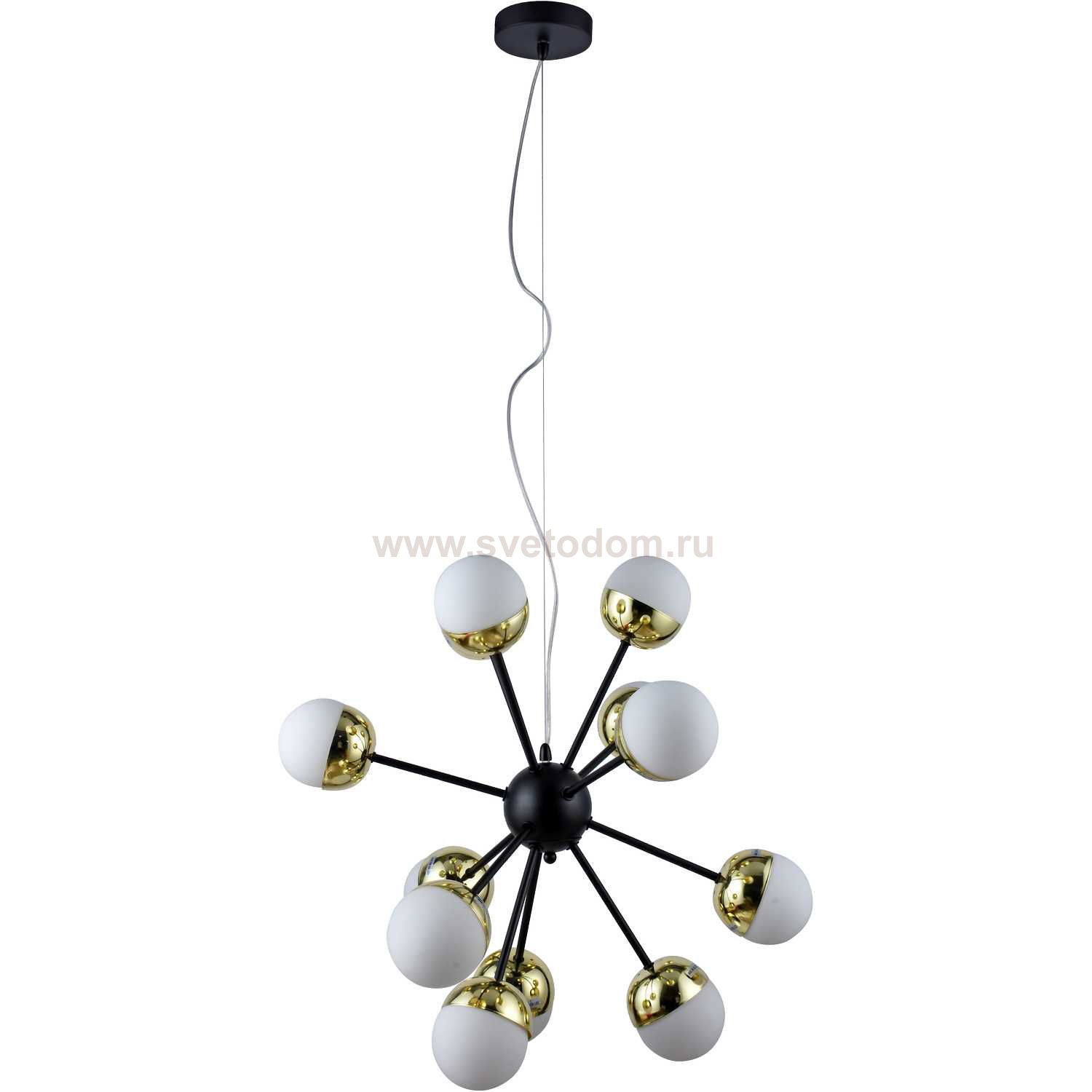 Люстра потолочная на штанге 2032/02/12P Stilfort, серия Accordo, цвет арматуры- черный и золото, цвет плафонов - белый, лампы - 12*G9 LED*3W, материал арматуры - металл, материал плафонов - стекло