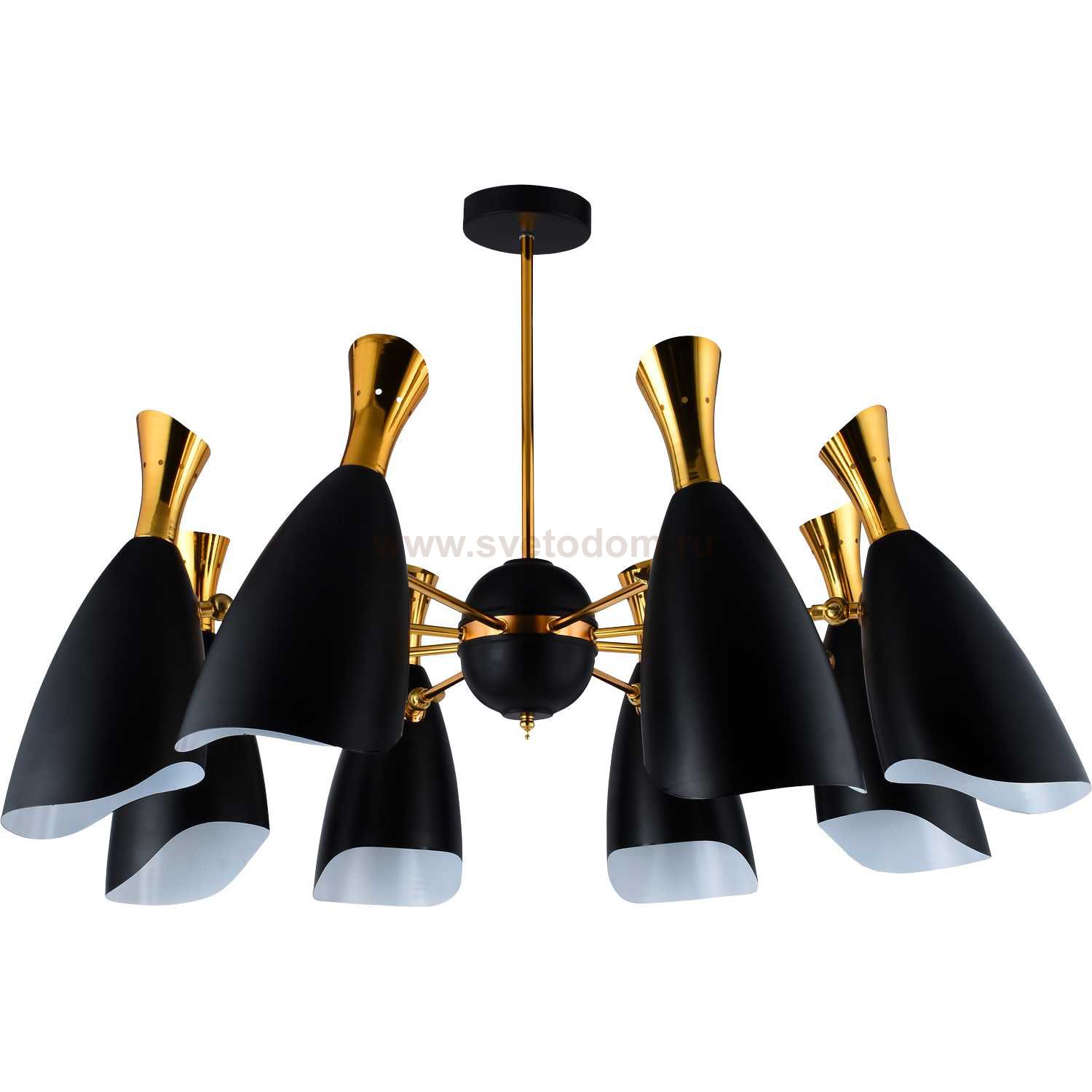 Люстра потолочная на штанге 2059/02/08P Stilfort, серия Ricon, цвет арматуры- черный и золото, цвет плафонов - черный и золото, лампы - 8*E14*40W, материал арматуры - металл, материал плафонов - металл