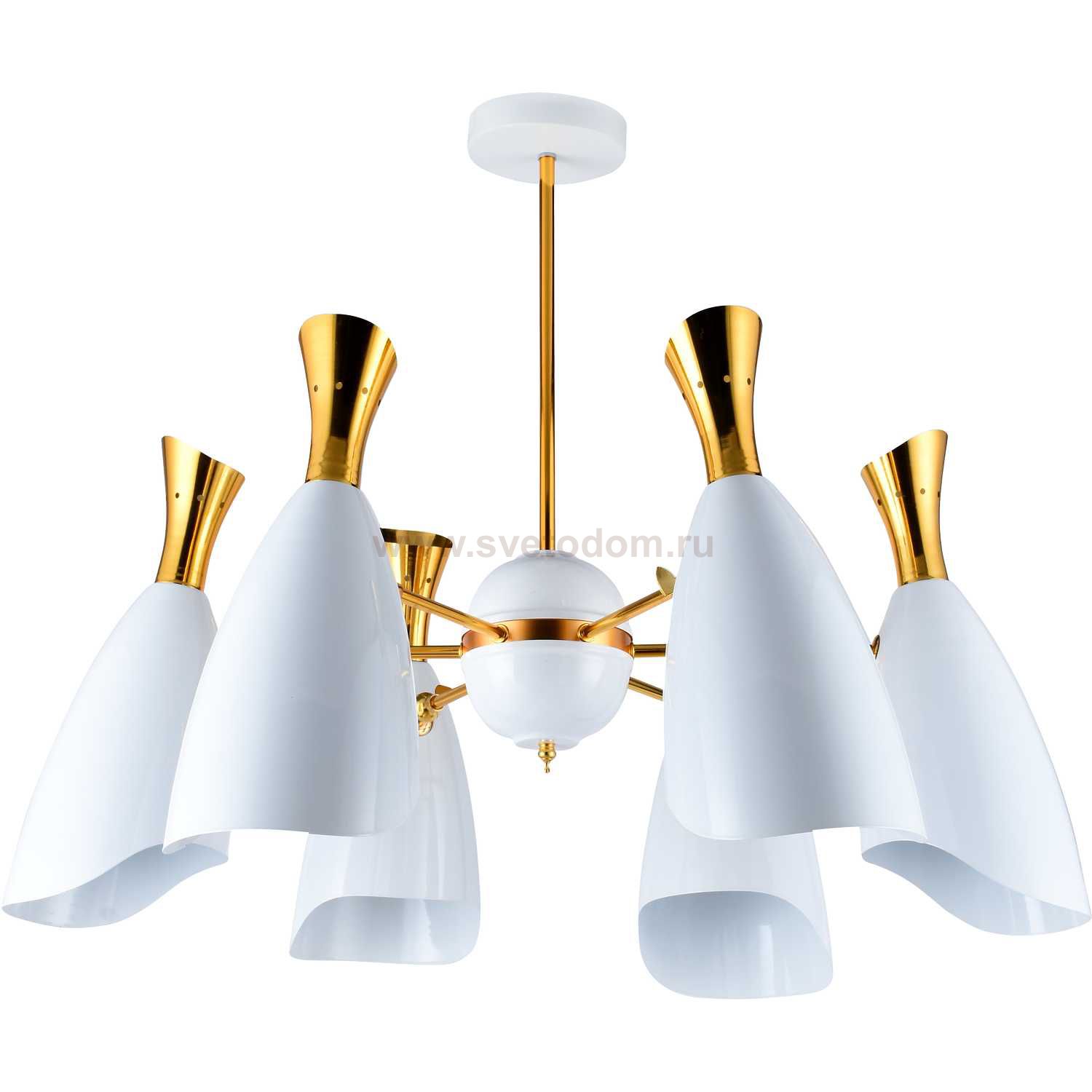 Люстра потолочная на штанге 2060/01/06P Stilfort серии Ricon выполнена в стиле лофт. Арматура изготовлена из окрашенного металла двух цветов - "белый" и "золото". Плафоны люстры металлические.