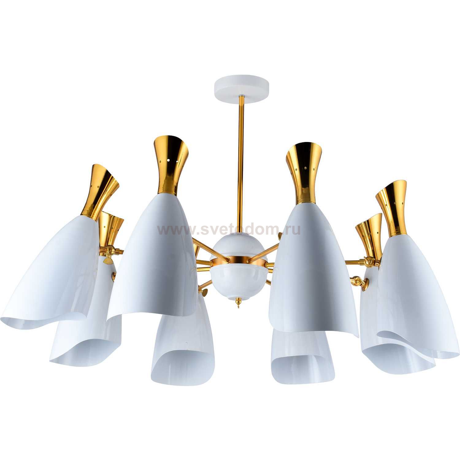Люстра потолочная на штанге 2060/01/08P Stilfort серии Ricon выполнена в стиле лофт. Арматура изготовлена из окрашенного металла двух цветов - "белый" и "золото". Плафоны люстры металлические.