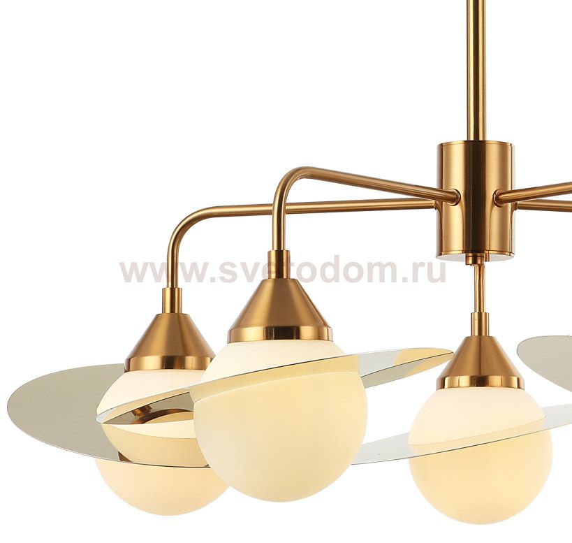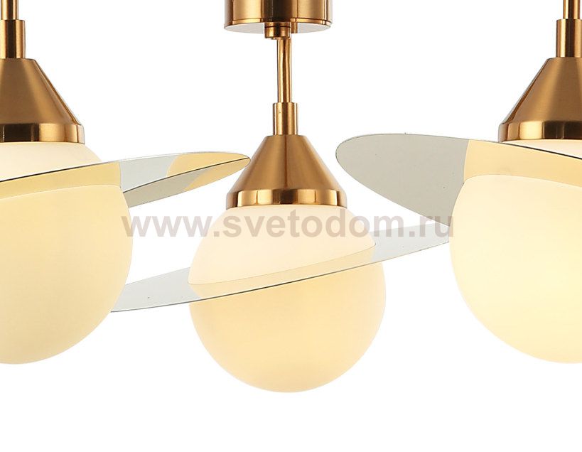 Люстра на штанге 2125/03/05P Stilfort серии Saturn выполнена в стиле модерн. Арматура изготовлена из металла в цвете "золото". Плафоны люстры выполнены в нежном белом цвете и украшены декоративной стеклянной орбитой.