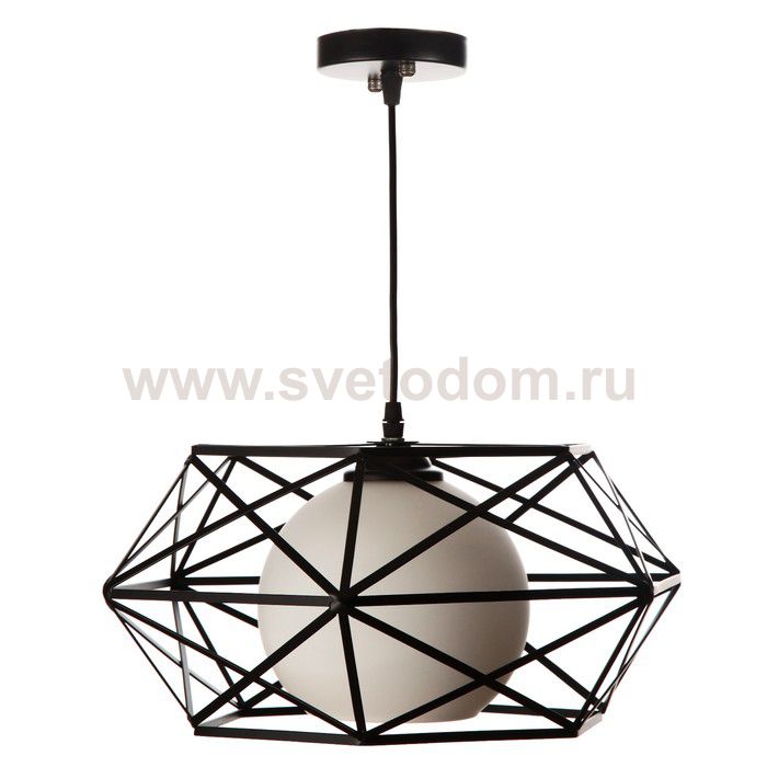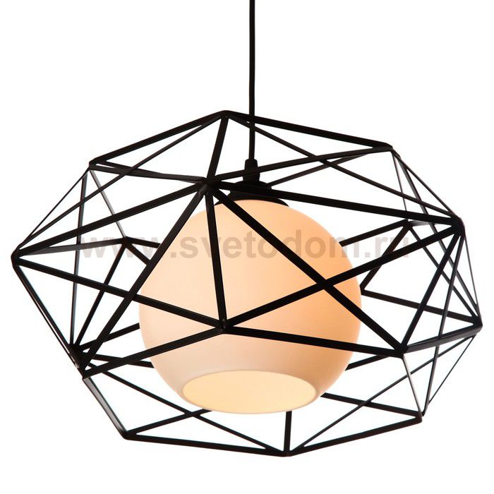 Светильник выполнен в стиле лофт. Имеет внутренний плафон из матового стекла. Подвес рассчитан на лампу 40 Вт, патрон E27. Корпус светильника выкрашен в чёрный. Высота регулируется. |