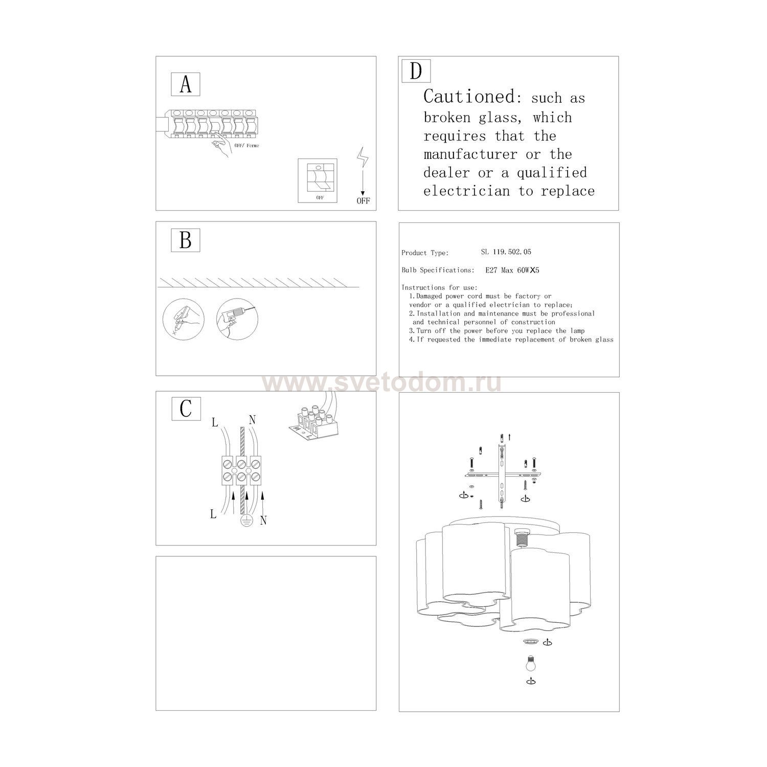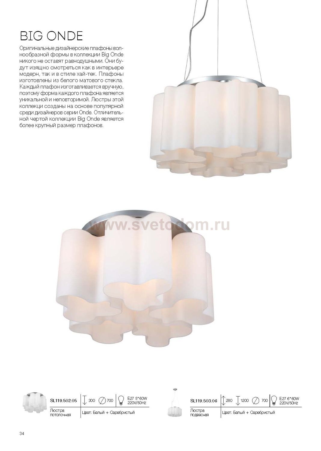 Касаемо коллекции модели St luce SL119.502.05 хотелось бы отметить основные моменты: Оригинальные дизайнерские плафоны волнообразной формы в коллекции Big Onde никого не оставят равнодушными. Они будут изящно смотреться как в интерьере модерн, так и в стиле хай-тек. Плафоны изготовлены из белого матового стекла. Каждый плафон изготавливается вручную, поэтому форма каждого плафона является уникальной и неповторимой. Люстры этой коллекци созданы на основе популярной среди дизайнеров серии Onde. Отличительной чертой коллекции Big Onde является более крупный размер плафонов.