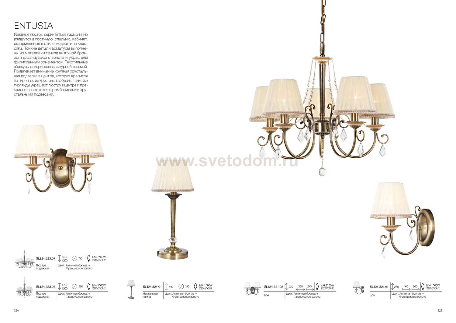 Касаемо коллекции модели St luce SL124.324.01 хотелось бы отметить основные моменты: Изящные люстры серии Entusia гармонично впишутся в гостиную, спальню, кабинет, оформленные в стиле модерн или классика. Тонкие детали арматуры выполнены из металла оттенков античной бронзы и французского золота и украшены филигранным орнаментом. Текстильные абажуры декорированы ажурной тесьмой. Привлекает внимание крупная хрустальная подвеска в центре, которая крепится на гирлянде из хрустальных бусин. Такие же гирлянды украшают люстру в центре и прекрасно сочетаются с ромбовидными хрустальными подвесами.