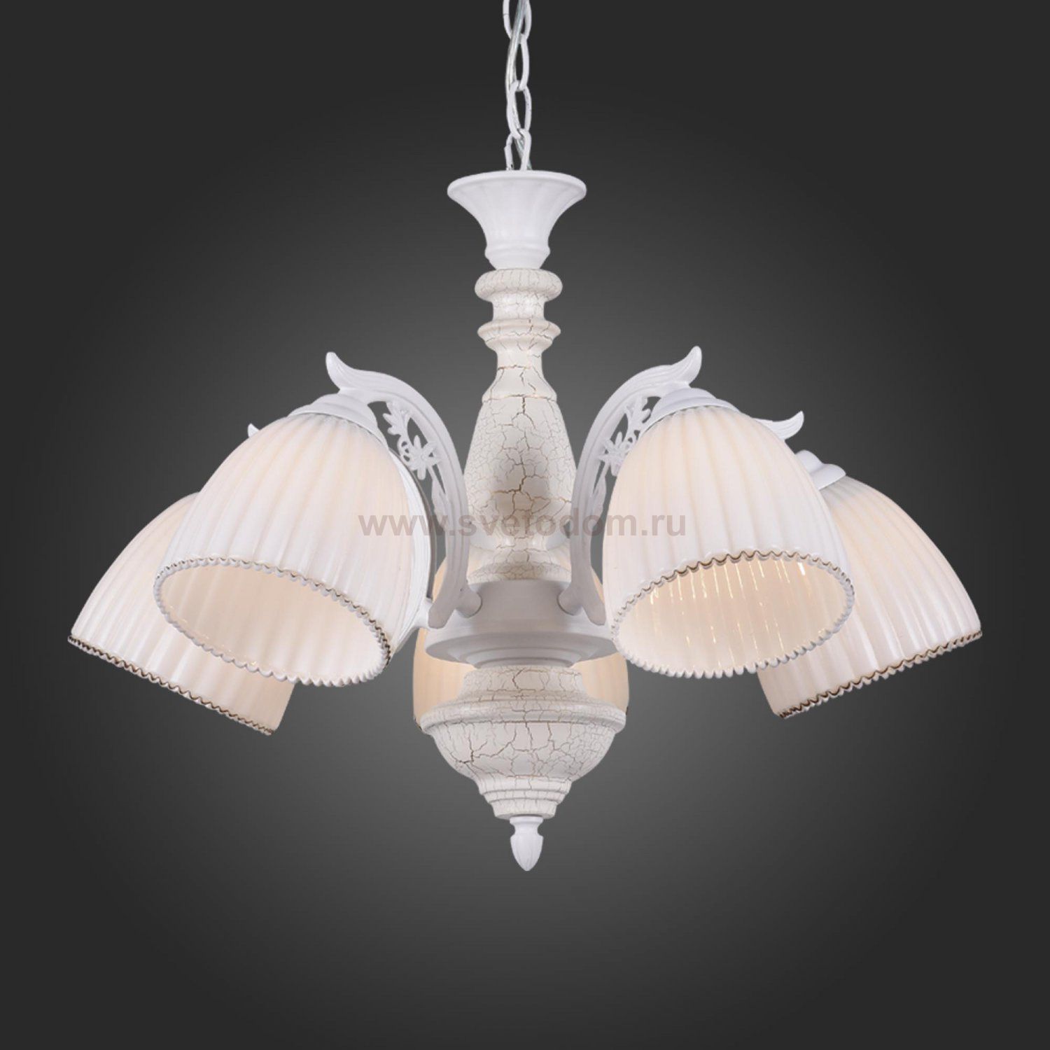 Касаемо коллекции модели St luce SL151.503.05 хотелось бы отметить основные моменты: Классическая форма светильников Fiore гармонично передаёт традиции и вкусы классических канонов. Светильники подходят для освещения и оформления интерьера гостиных, спален, столовых в классическом стиле или стиле Гранж. Металлическое основание люстры окрашно в белый цвет и искусственно состарено. Стеклянные плафоны по краю вручную расписаны золотым узором.