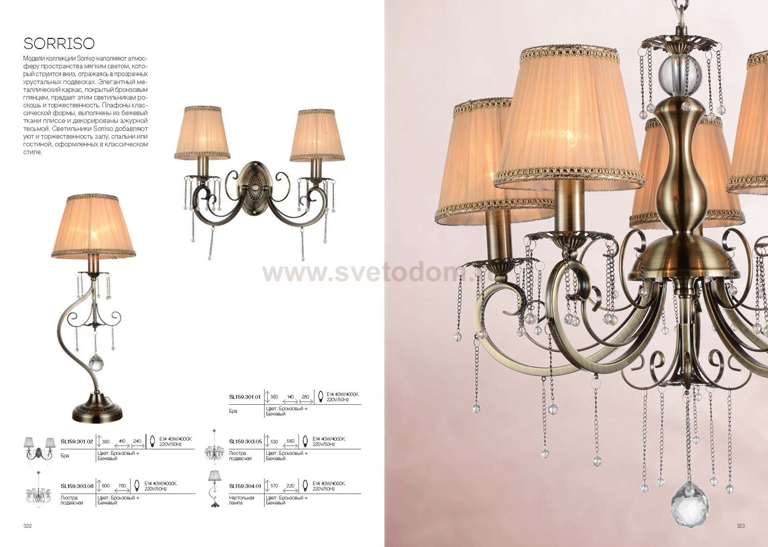Если Вы настроены купить светильник модели SL15930102, то обратите внимание: Модели коллекции Sorriso наполняют атмосферу пространства мягким светом, который струится вниз, отражаясь в прозрачных хрустальных подвесках. Элегантный металлический каркас, покрытый бронзовым глянцем, придает этим светильникам роскошь и торжественность. Плафоны классической формы, выполнены из бежевой ткани плиссе и декорированы ажурной тесьмой .Светильники Sorriso добавляют уют и торжественность залу, спальне или гостиной, оформленных в классическом стиле