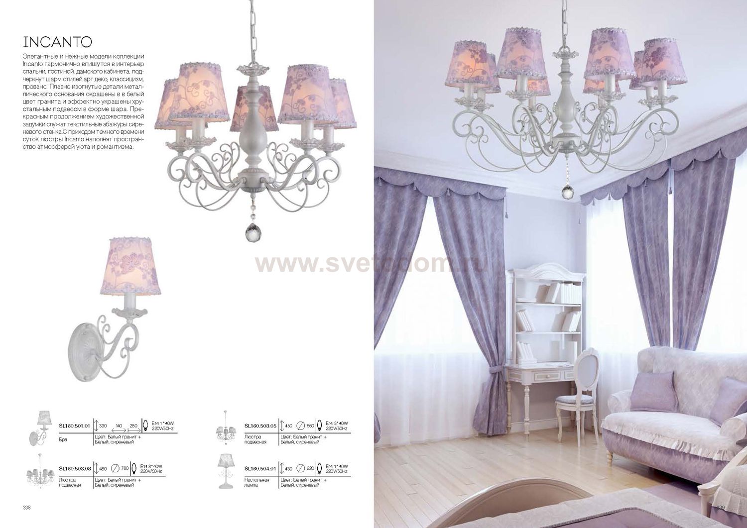 Если Вы настроены купить светильник модели SL16050305, то обратите внимание: Элегантные и нежные модели коллекции Incanto гармонично впишутся в интерьер спальни, гостиной, дамского кабинета, подчеркнут шарм стилей арт- деко, классицизма, прованса, неоклассики. Плавно изогнутые детали металлического основания окрашены в белый цвет гранита и эффектно украшены хрустальным подвесом в форме шара. Прекрасным продолжением художественной задумки дизайнеров служат текстильные абажуры сиреневого отенка.С приходом темного времени суток люстры Incanto наполнят пространство атмосферой уюта и романтизма.