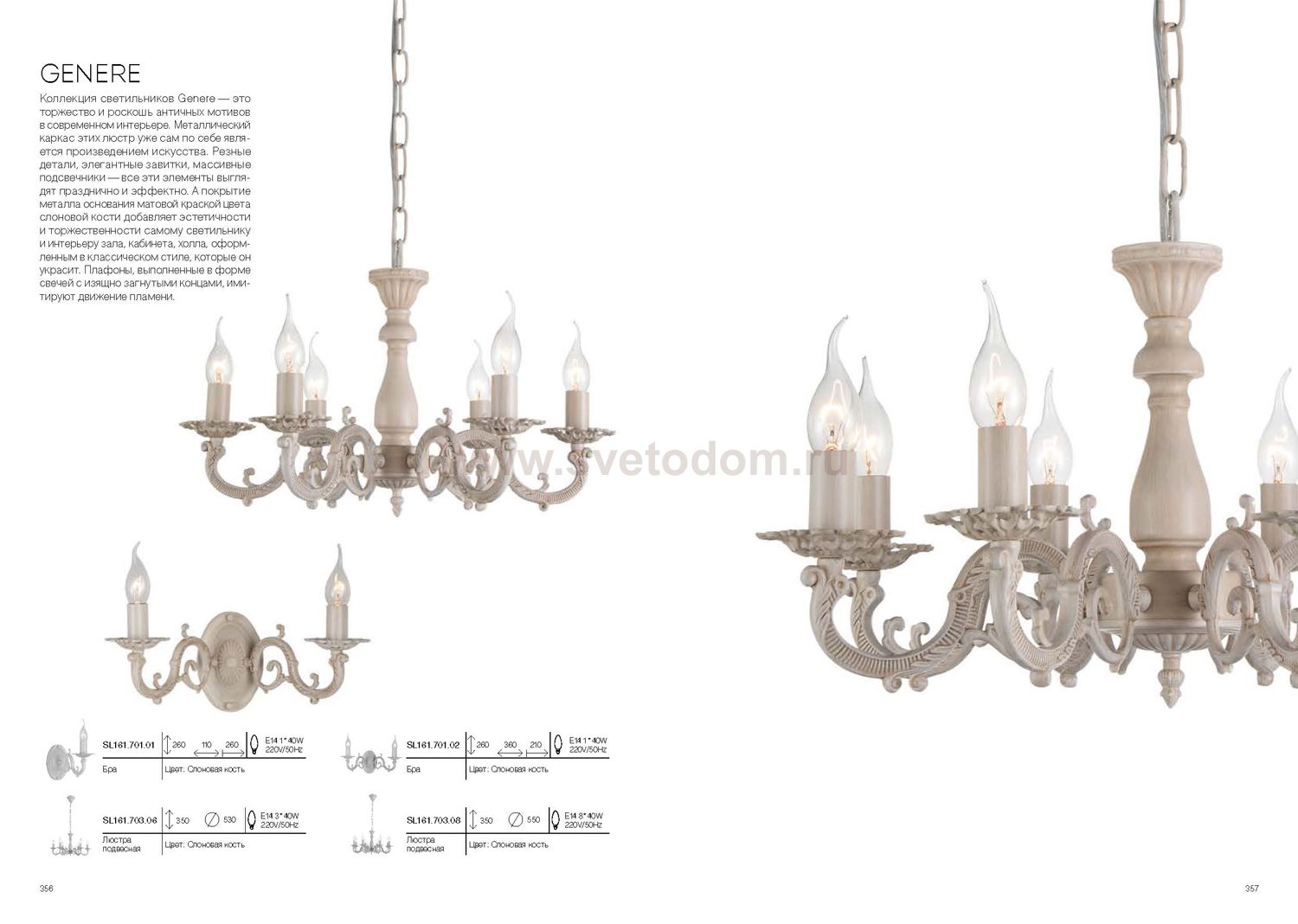 Если Вы настроены купить светильник модели SL16170306, то обратите внимание: Коллекция светильников Genere - это торжество и роскошь античных мотивов в современном интерьере. Металлическое основание этих люстр уже само по себе является произведением искусства. Резные детали, элегантные завитки, массивные подсвечники - все эти элементы выглядят празднично и эффектно. А покрытие металла основания матовой краской цвета слоновой кости добавляет эстетичности и торжественности самому светильнику и интерьеру зала, кабинета, холла, которые он украсит.