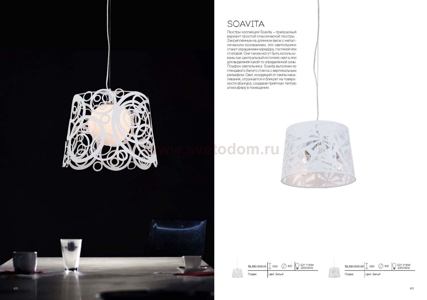 Если Вы настроены купить светильник модели SL23050303, то обратите внимание: Белоснежные подвесные светильники коллекции Soavita озарят светом и подарят нотку нежности любому пространству. Плафоны изготовлены из белого металла путем лазерной резки и напоминают о вышивке и кружеве . Элегантные светильники могут быть установлены в гостиной, столовой или комнате отдыха.