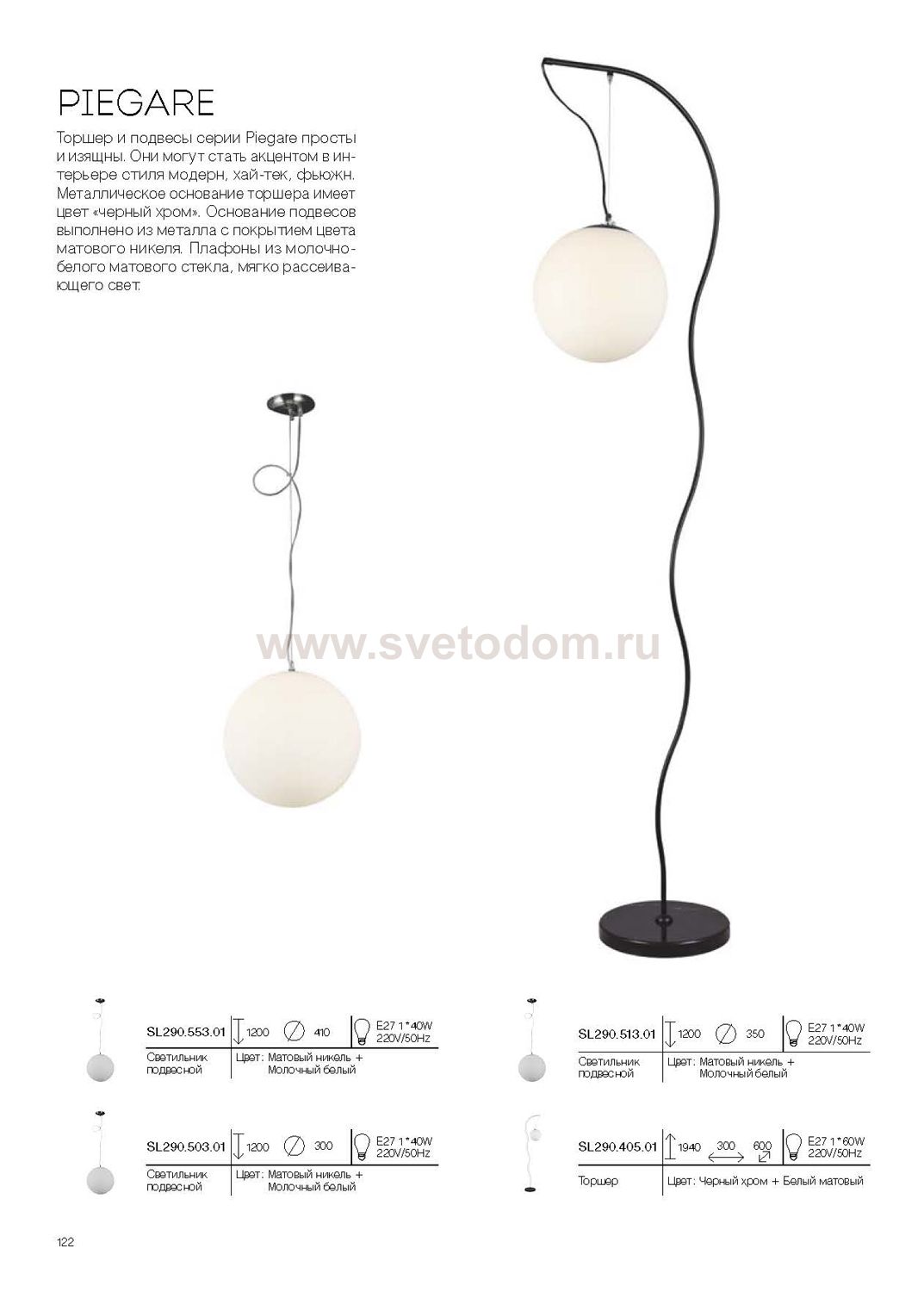 Касаемо коллекции модели St luce SL290.553.01 хотелось бы отметить основные моменты: Торшер и подвесы серии Piegare просты и изящны. Они могут стать акцентом в интерьере стиля модерн, хай-тек, фьюжн. Металлическое основание торшера имеет цвет «черный хром». Основание подвесов выполнено из металла с покрытием цвета матового никеля. Плафоны из молочнобелого матового стекла, мягко рассеивающего свет.
