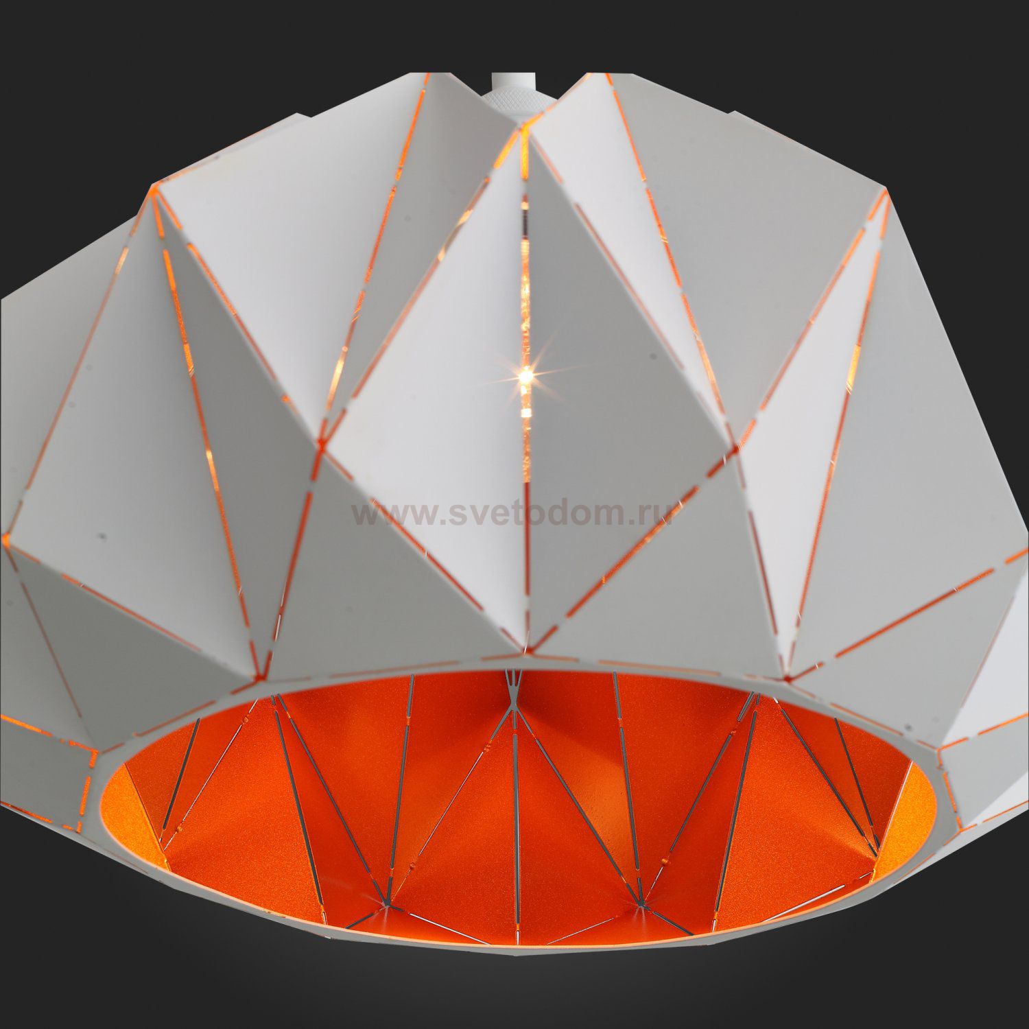 Светильник FUOCO имеет необычные, ломанные линии и напоминает фигурку оригами. Плафон выполнен из металла, внешняя сторона белого цвета, а внутренняя сторона светильника золотого цвета. Светильник FUOCO украсить пространство над столом,а также станет прекрасным выбором для кафе или бара.