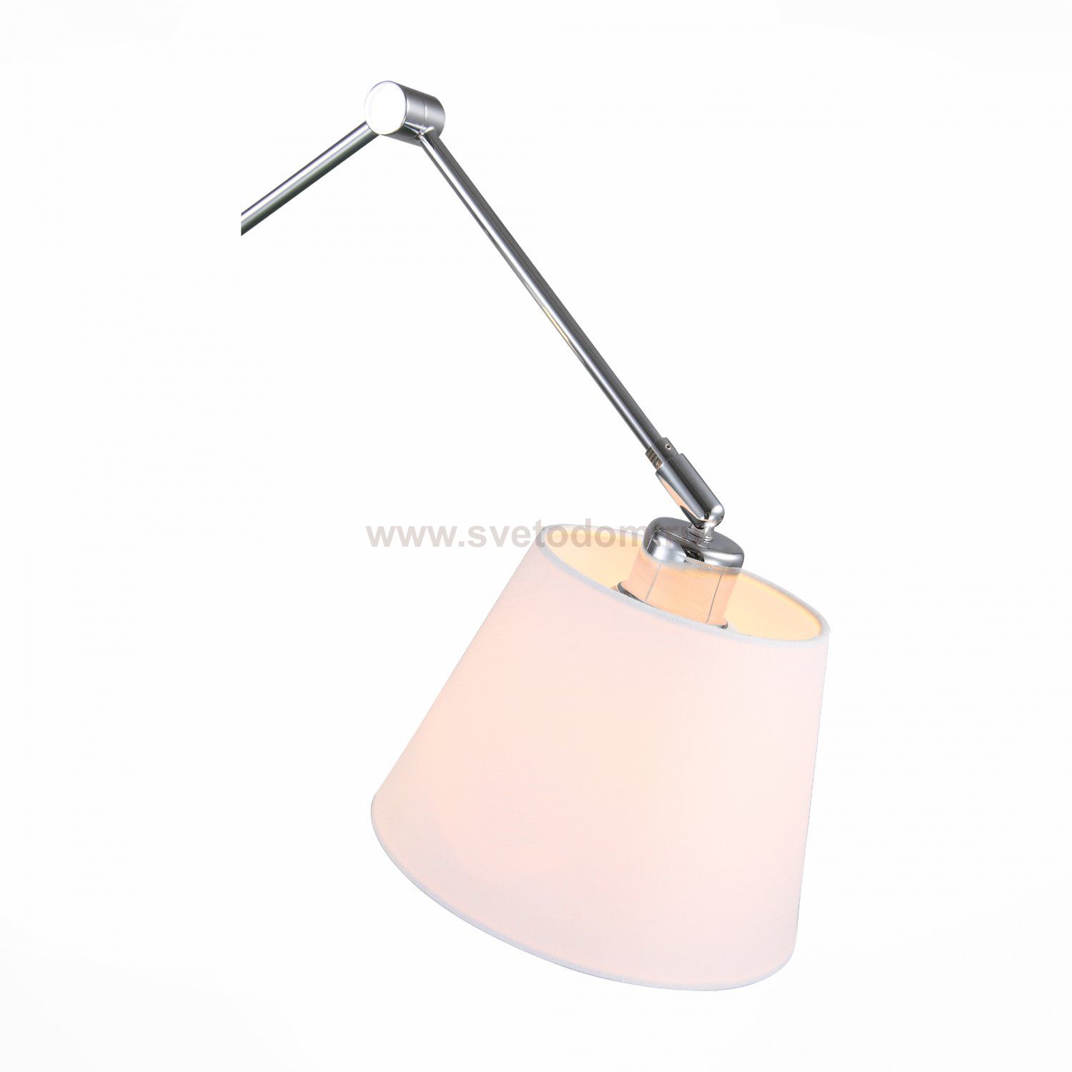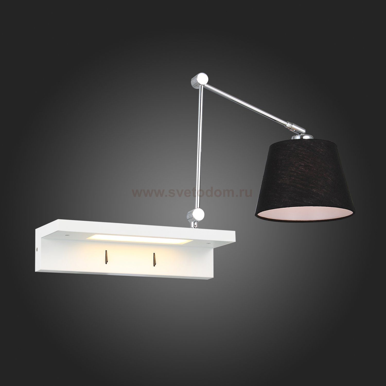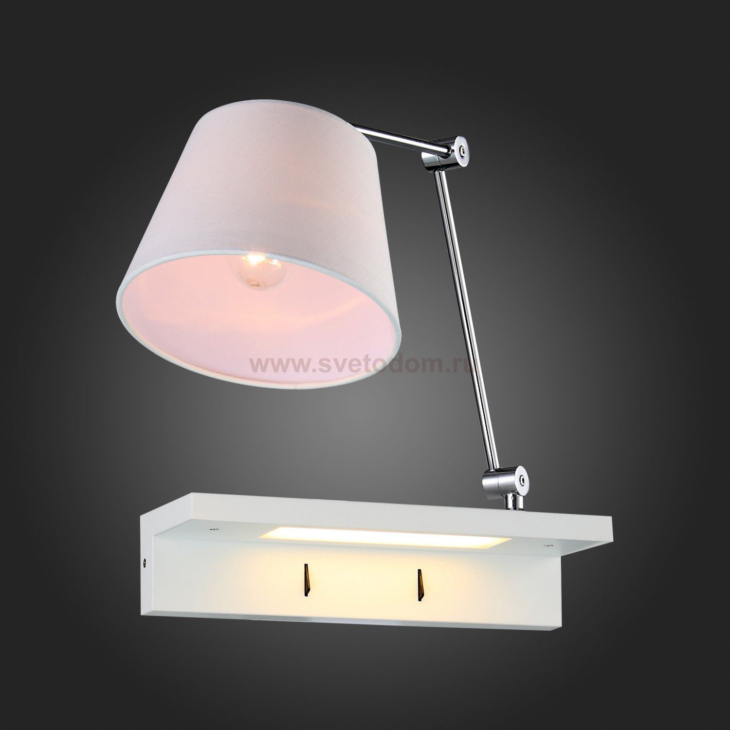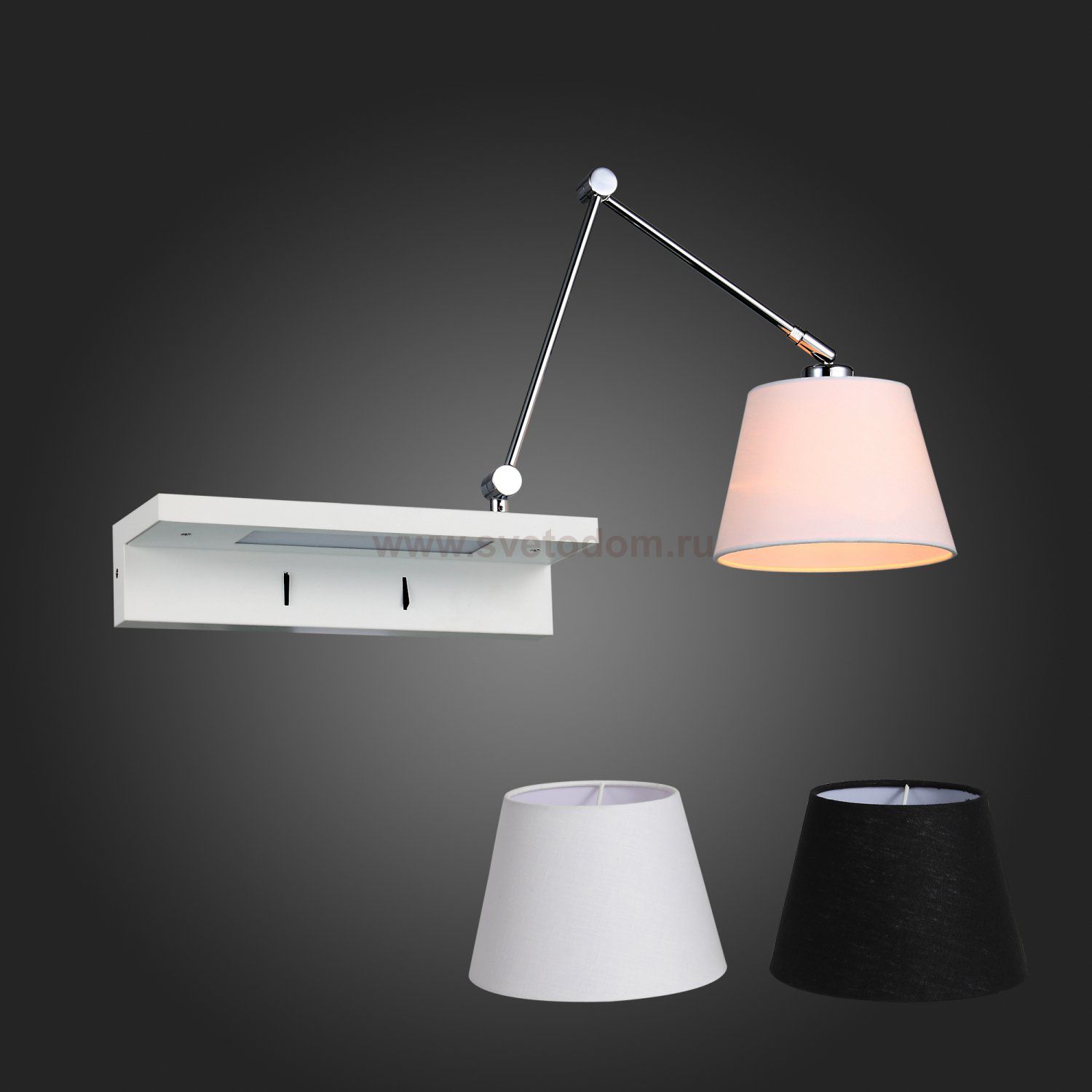 Бра коллекции Instrada будет прекрасно смотреться в коридоре, спальне, на кухне, прихожей или других помещениях. Эти стильные и многофункциональные модели созданы для современных динамичных людей, любящих комфорт и возможность превращений. Металлическое основание светильника выполнено в виде полочки, окрашенной в белый цвет и имеющей собственную подсветку, а также держателя плафона цвета хром. Благодаря шарнирным сочленениям держатель плафона может совершать разнообразные поворотные движения в пространстве, освещая помещение.Каждый светильник коллекции Instrada снабжен белым и черным тканевыми абажурами.