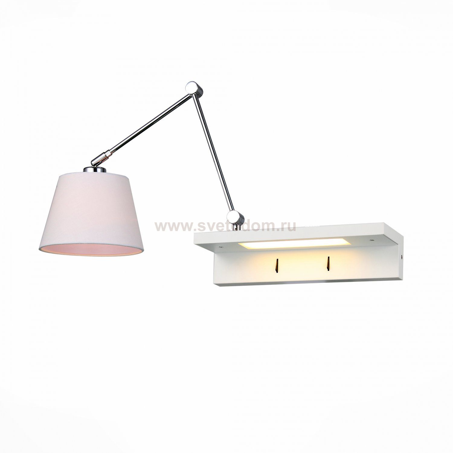 Бра коллекции Instrada будет прекрасно смотреться в коридоре, спальне, на кухне, прихожей или других помещениях. Эти стильные и многофункциональные модели созданы для современных динамичных людей, любящих комфорт и возможность превращений. Металлическое основание светильника выполнено в виде полочки, окрашенной в белый цвет и имеющей собственную подсветку, а также держателя плафона цвета хром. Благодаря шарнирным сочленениям держатель плафона может совершать разнообразные поворотные движения в пространстве, освещая помещение.Каждый светильник коллекции Instrada снабжен белым и черным тканевыми абажурами.