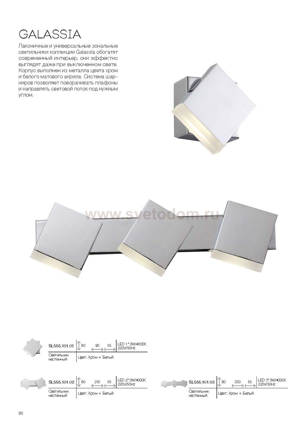 Если Вы настроены купить светильник модели SL55510103, то обратите внимание: Лаконичные и универсальные зональные светильники коллекции Galassia обогатят современный интерьер, они эффектно выглядят даже при выключенном свете. Корпус выполнен из металла цвета хром и белого матового акрила. Система шарниров позволяет поворачивать плафоны и направлять световой поток под нужным углом.