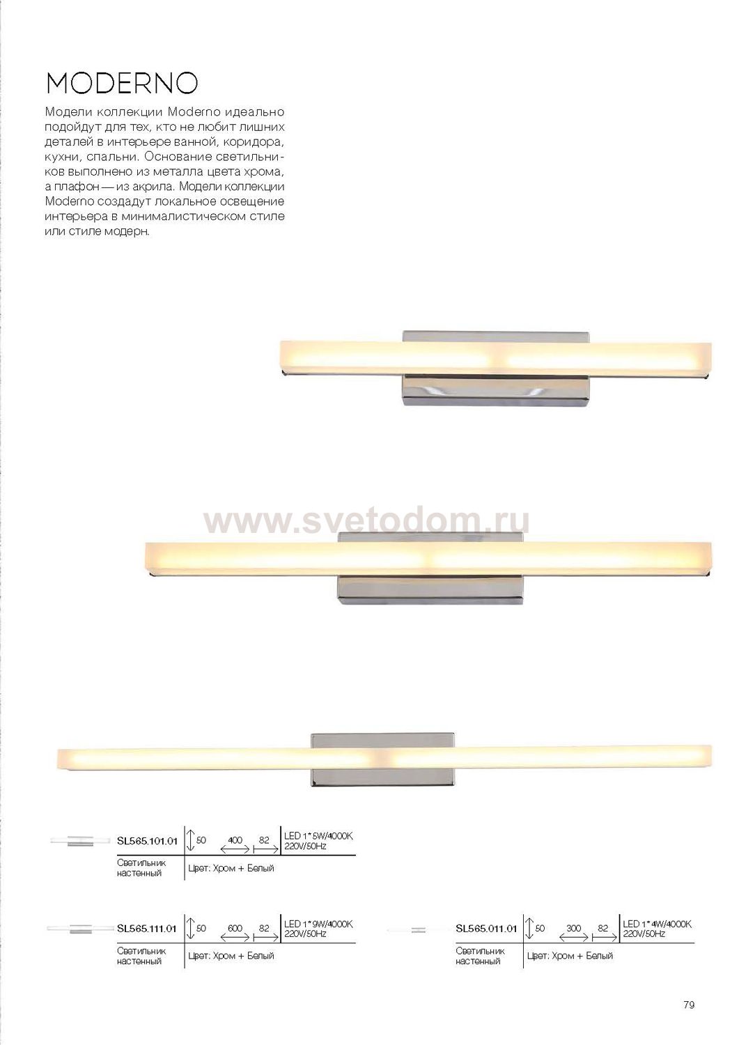 Если Вы настроены купить светильник модели SL56510101, то обратите внимание: Модели коллекции Moderno идеально подойдут для тех, кто не любит лишних деталей в интерьере ванной, коридора, кухни, спальни. Основание светильников выполнено из металла цвета хрома, а плафон- из акрила. Модели коллекции Moderno создадут локальное освещение интерьера в минималистическом стиле или стиле модерн.