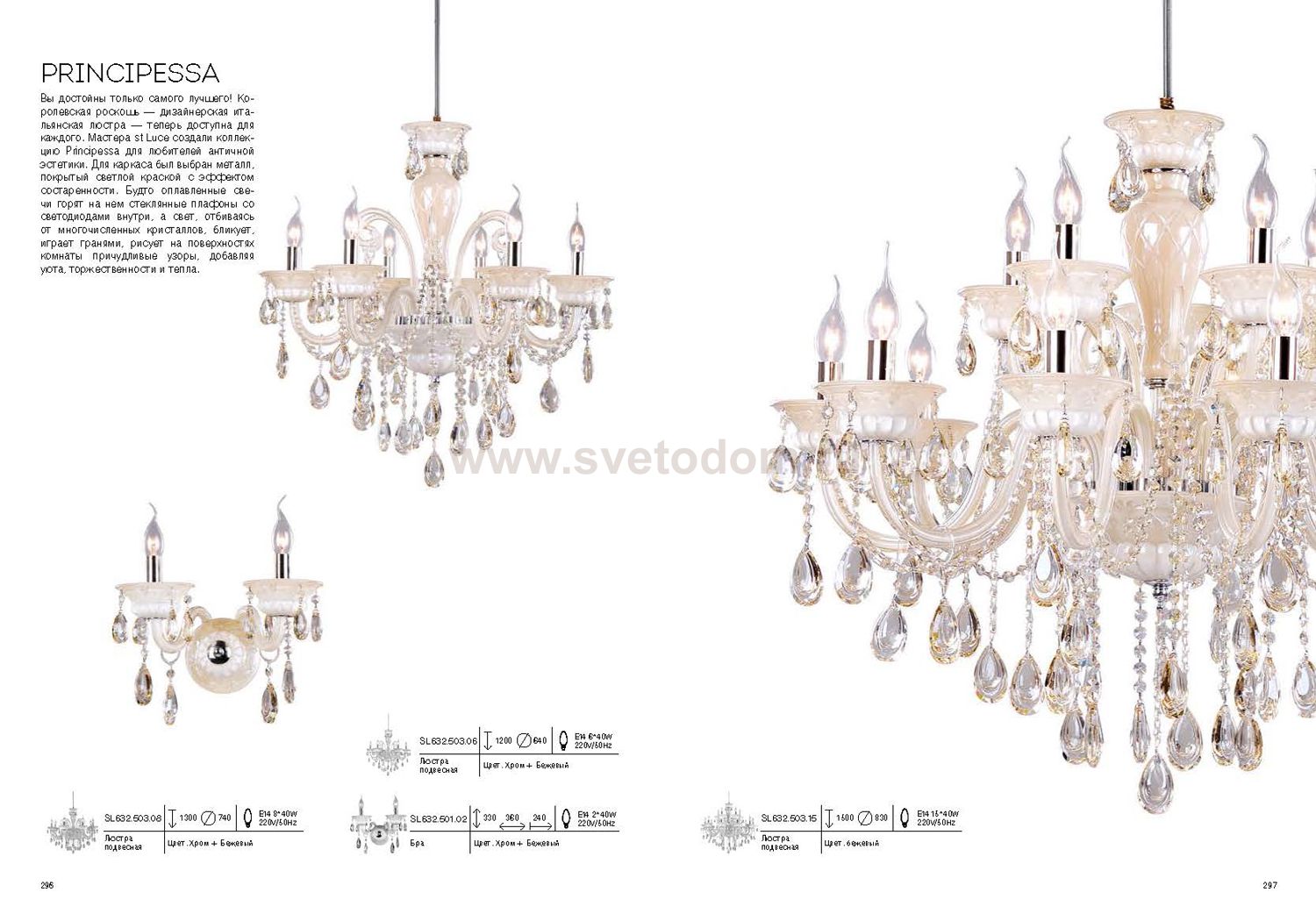 Если Вы настроены купить светильник модели SL63250306, то обратите внимание: Пышное убранство люстр коллекции Principessa приковывает к себе восторженные взгляды. Арматура сделана из стекла , окрашенного в разные оттенки карамельного бежевого цвета. Со вкусом продуманные подсвечники, , блеск декоративных хрустальных капель цвета шампань , глянец хромированных детале, делают светильник по- настоящему нарядным и праздничным.