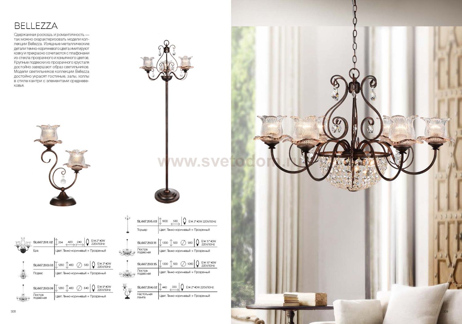 Если Вы настроены купить светильник модели SL66720309, то обратите внимание: Сдержанная роскошь и романтичность- так можно охарактеризовать модели коллекции Bellezza. Изящные детали металлического основания темно- коричневого цвета имитируют ковку и прекрасно сочетаются с плафонами из стекла прозрачного и коньячного цветов . Крупные подвески из прозрачного хрусталя достойно завершают элегантный образ светильников. Модели люстр коллекции Bellezza достойно украсят гостиные, залы, холлы в стиле кантри с элементами средневековья