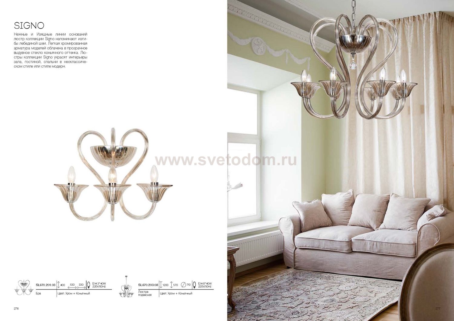 Нежные и Изящные линии оснований люстр коллекции Signo напоминают изгибы лебединой шеи. Легкая хромированная арматура моделей облачена в прозрачное выдувное стекло коньячного оттенка. Люстры коллекции Signo украсят интерьеры зала, гостиной, спальни в неоклассическом стиле или стиле модерн.