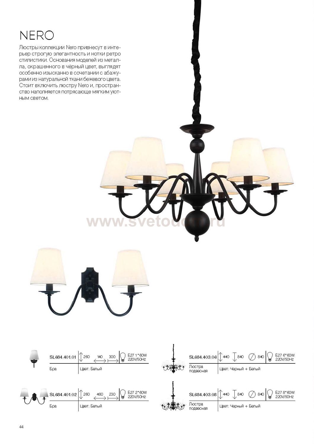 Если Вы настроены купить светильник модели SL68440308, то обратите внимание: Люстры коллекции Nero привнесут в интерьер строгую элегантность и нотки ретро стилистики. Основания моделей из металла, окрашенного в чёрный цвет, выглядит особенно изысканно в сочетании с абажурами из натуральной ткани цвета беж. Стоит включить люстру Nero и , пространство наполняется потрясающе мягким уютным светом.