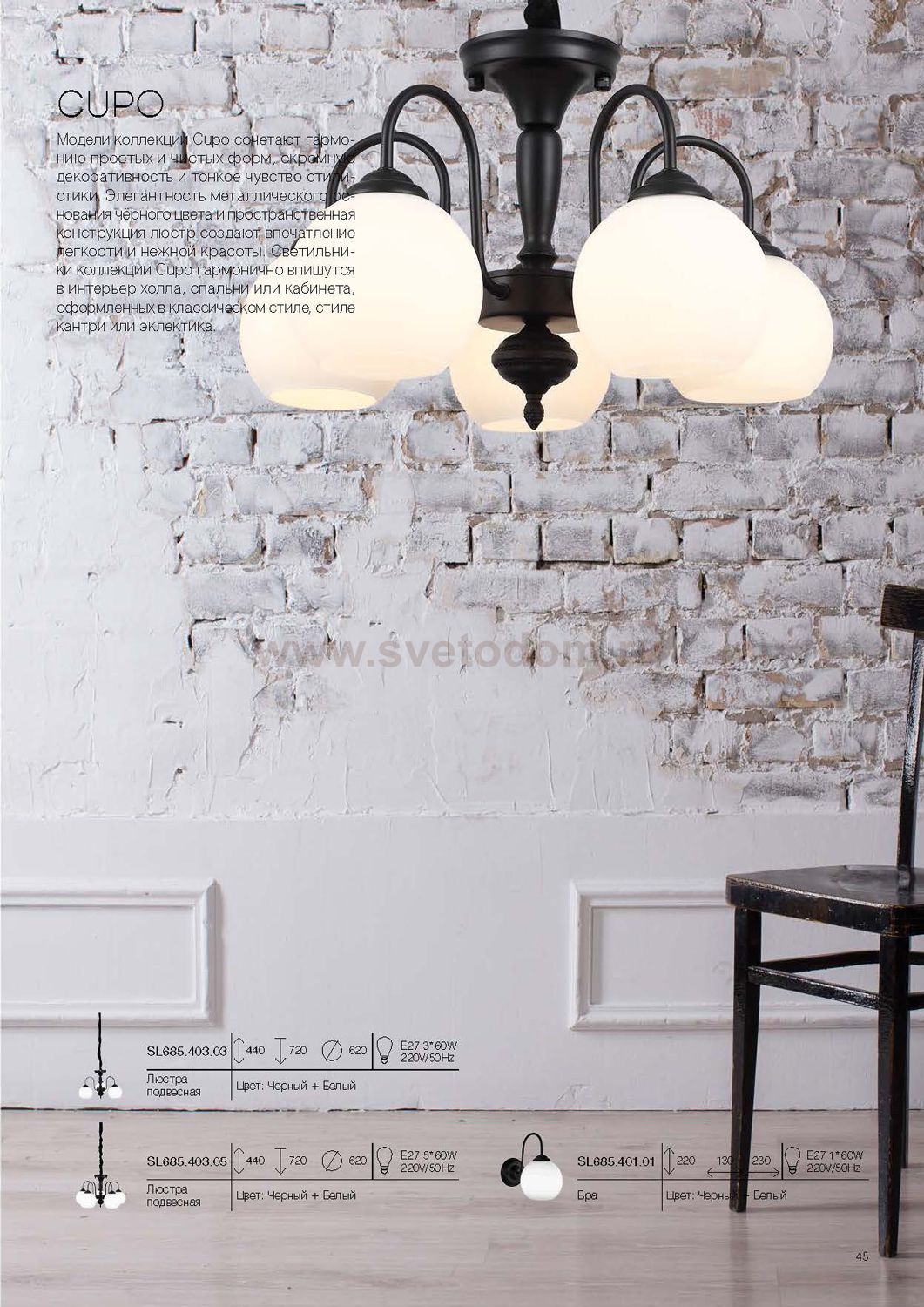 Если Вы настроены купить светильник модели SL68540303, то обратите внимание: Модели коллекции Cupo сочетают гармонию простых и чистых форм, скромную декоративность и тонкое чувство стилистики. Элегантность металлического основания чёрного цвета и пространственная конструкция люстр создают впечатление легкости и нежной красоты. Светильники коллекции Cupo гармонично впишутся в интерьер холла, спальни или кабинета, оформленных в классическом стиле, стиле кантри или эклектика.