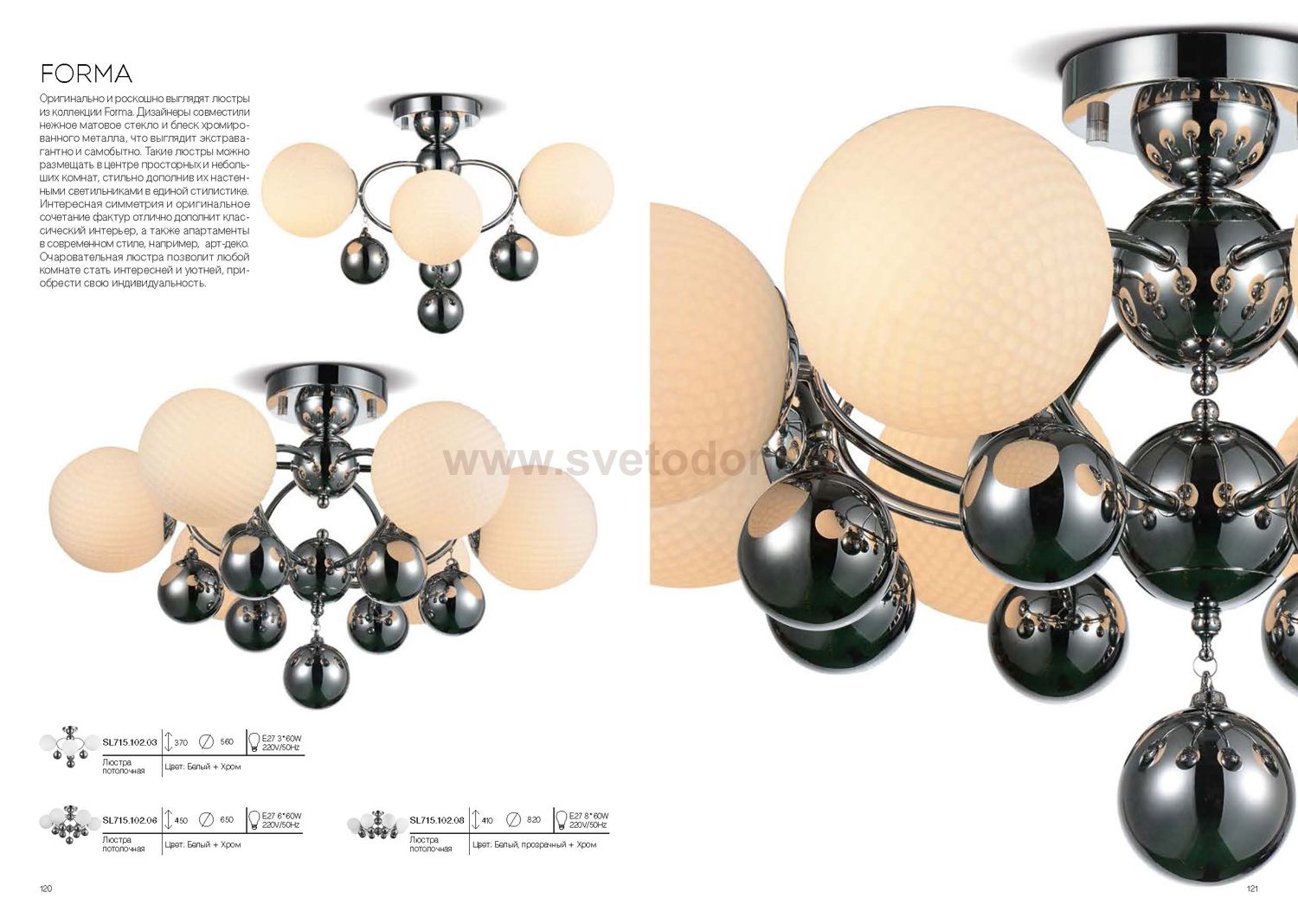 Если Вы настроены купить светильник модели SL71510203, то обратите внимание: Оригинально и роскошно выглядят люстры из коллекции Forma. Дизайнеры совместили нежное матовое стекло и блеск хромированного металла, что выглядит весьма экстравагантно и самобытно. Такие люстры можно размещать в центре просторных и небольших комнат, стильно дополнив их настенными светильниками в единой стилистике. Интересная симметрия и оригинальное сочетание фактур отлично дополнит классический интерьер, а также апартаменты в современном стиле, например, арт-деко. Очаровательная люстра позволит любой комнате стать интересней и уютней, приобрести свою индивидуальность.