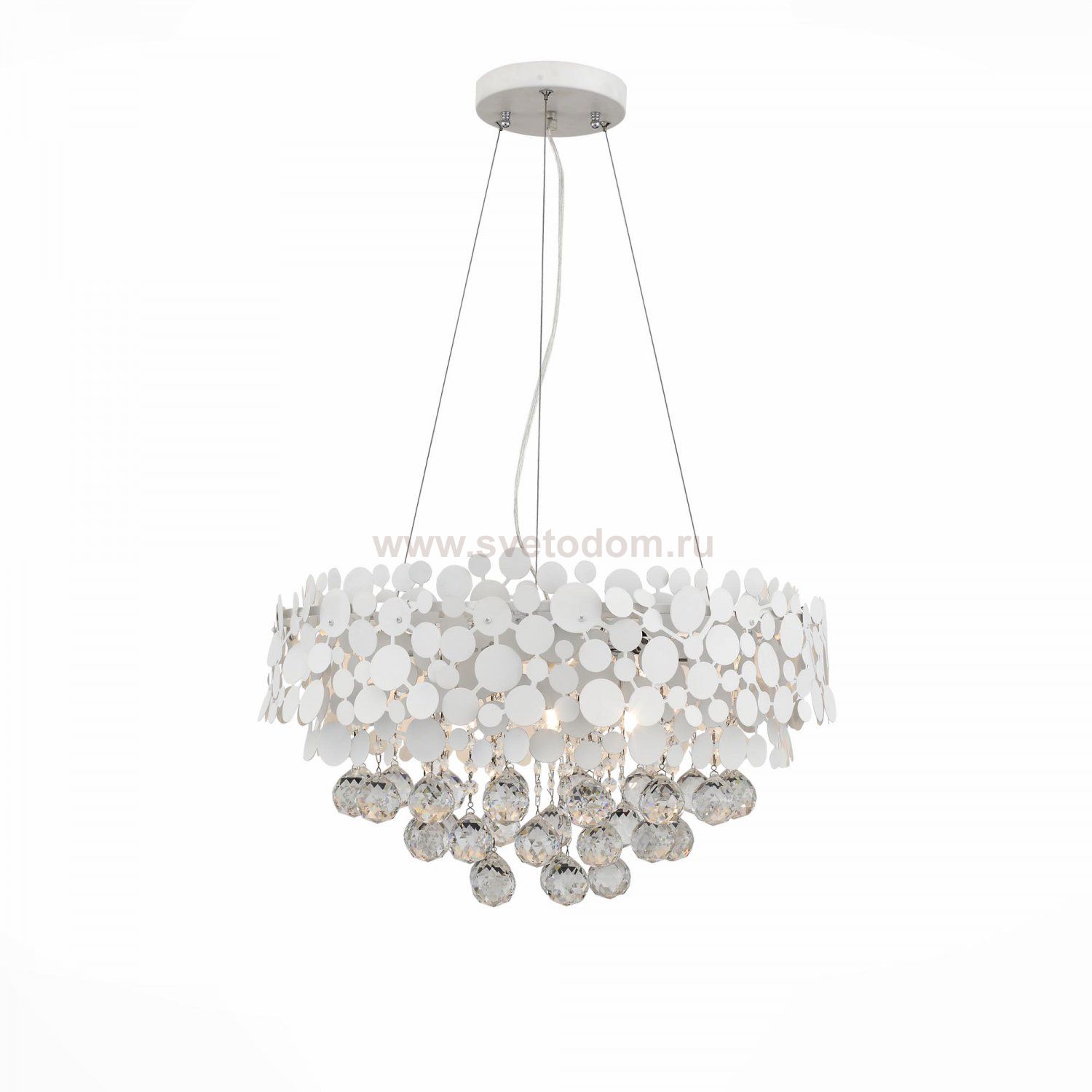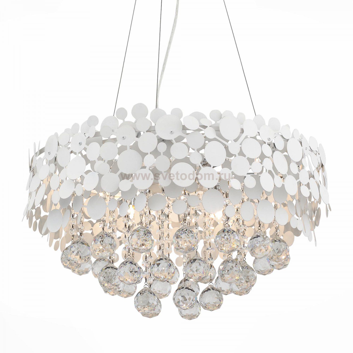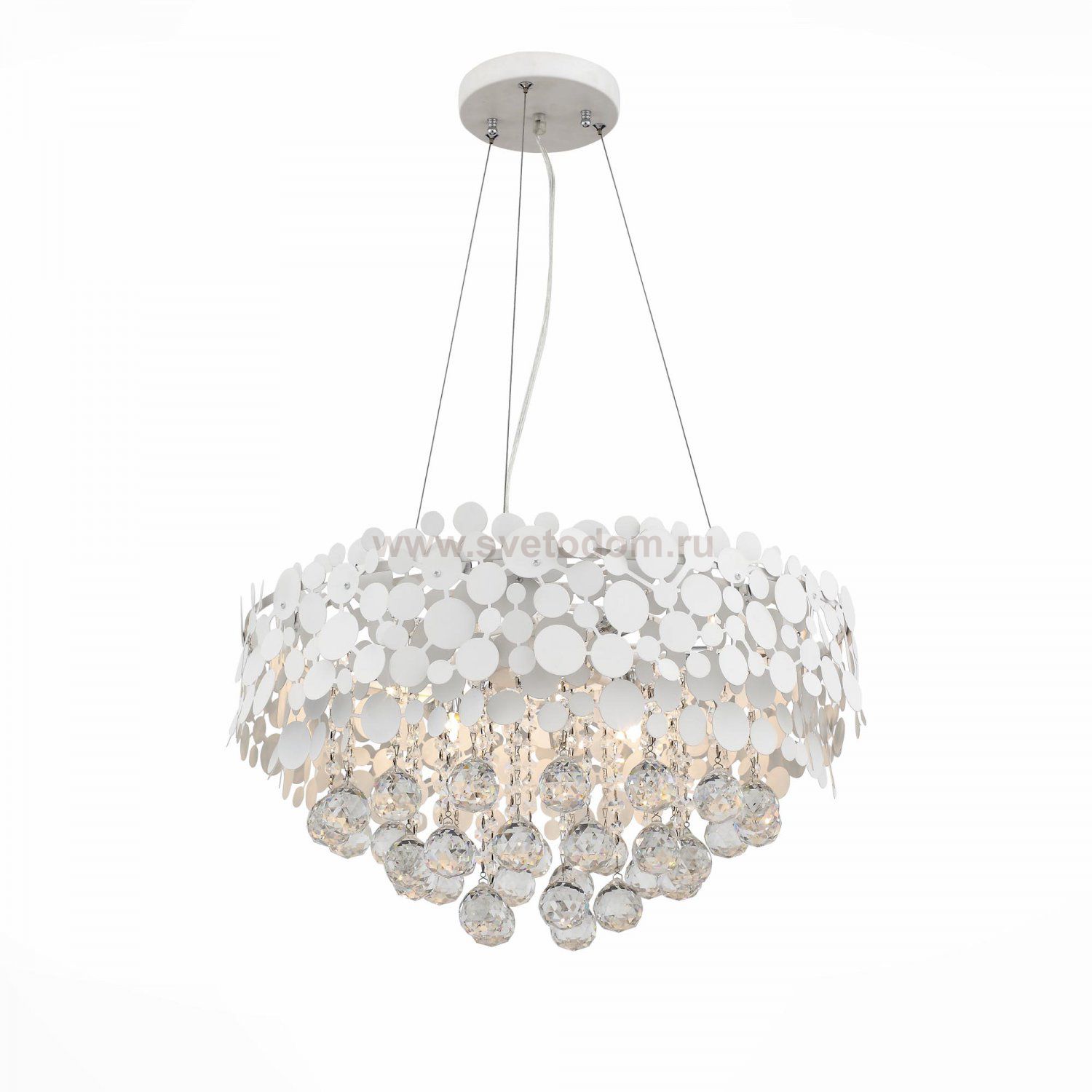 Касаемо коллекции модели St luce SL790.503.09 хотелось бы отметить основные моменты: Люстры серии Filetto роскошны и элегантны, как многие декоративные вещи эпохи арт-деко и модерн. Основание и абажур светильников выполнены из металла белого или черного цвета. Ажурность абажура достигнута за счет лазерной резки металла. Из-под абажура спускаются многочисленные хрустальные подвесы, переливы которых завораживают.