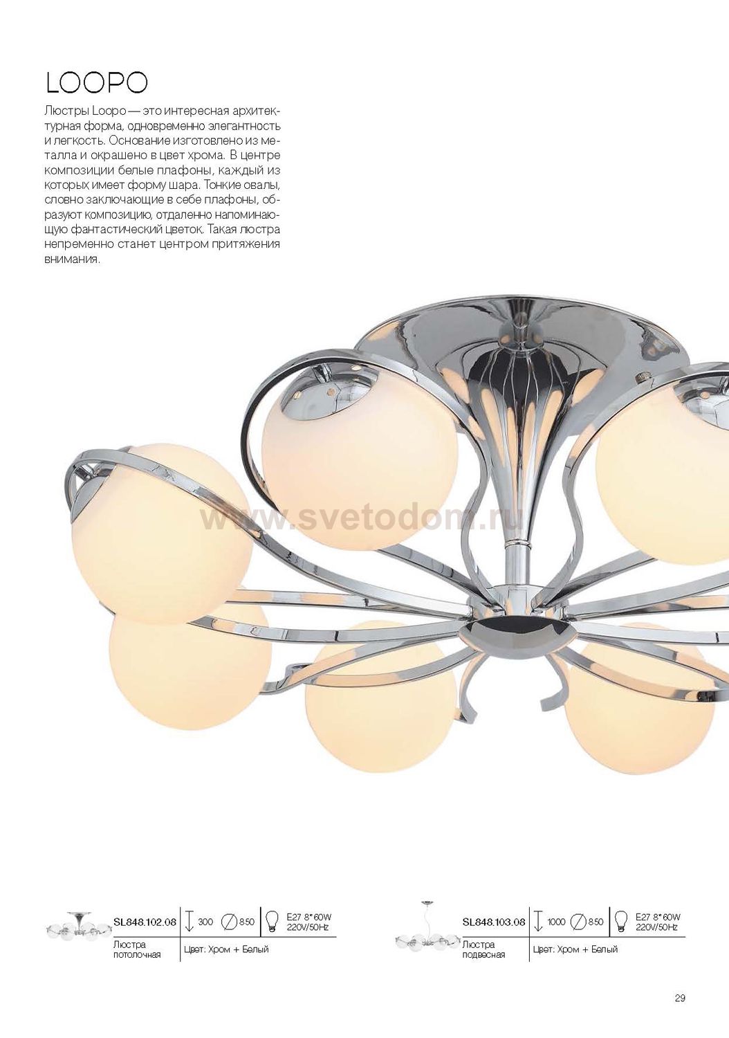 Если Вы настроены купить светильник модели SL84810208, то обратите внимание: Люстры Loopo – это интересная архитектурная форма,одновременно элегантность и легкость . Основание изготовлено из металла и окрашено в цвет хрома . В центре композиции белые плафоны, каждый из которых имеет форму шара. Тонкие овалы, словно заключающие в себе плафоны, образуют композицию, отдаленно напоминающую фантастический цветок . Такая люстра непременно станет центром притяжения внимания.
