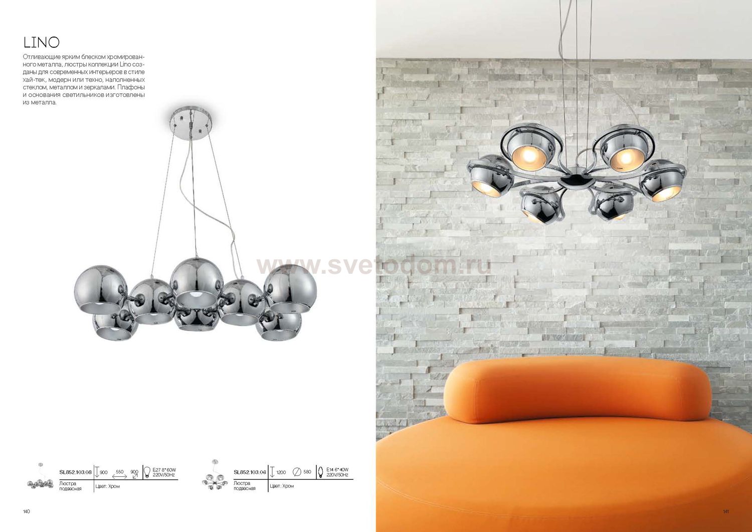 Касаемо коллекции модели St luce SL852.103.06 хотелось бы отметить основные моменты: Отливающие ярким блеском хромированного металла, люстры коллекции Lino созданы для современных интерьеров в стиле хай-тек, модерн или техно, наполненных стеклом, металлом и зеркалами. Плафоны и основания светильников изготовлены из металла.