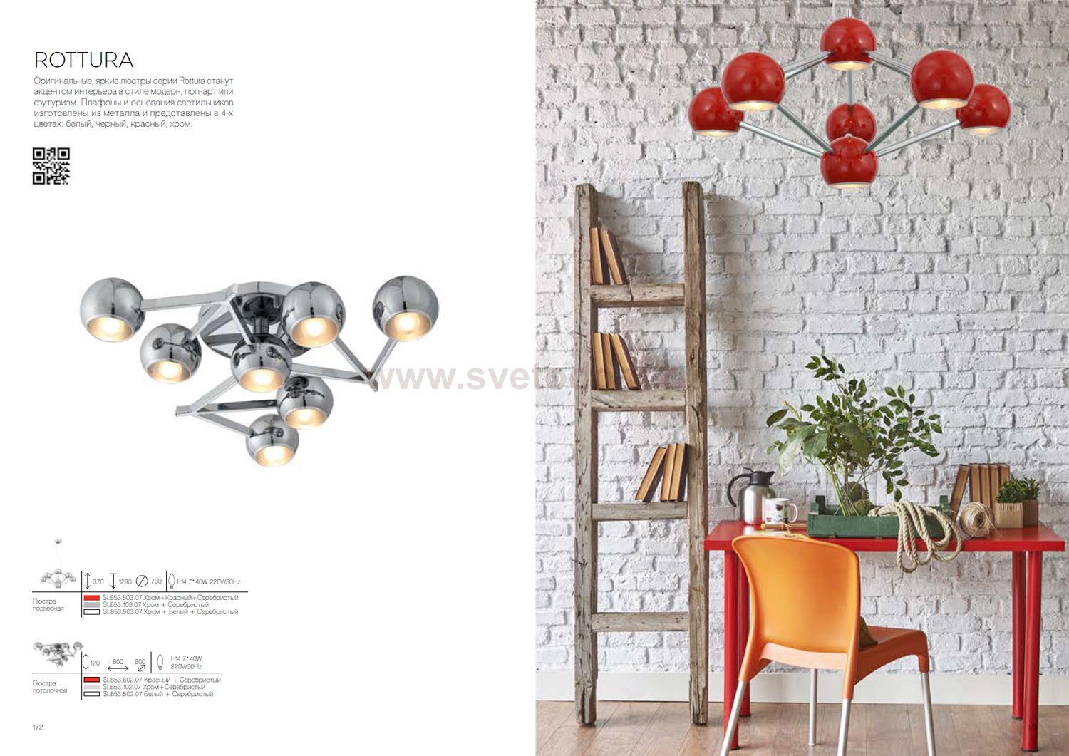 Касаемо коллекции модели St luce SL853.602.07 хотелось бы отметить основные моменты: Оригинальные, яркие люстры серии Rottura станут акцентом интерьера в стиле модерн, поп-арт или футуризм. Плафоны и основания светильников изготовлены из металла и представлены в 4-х цветах: белый, черный, красный, хром.