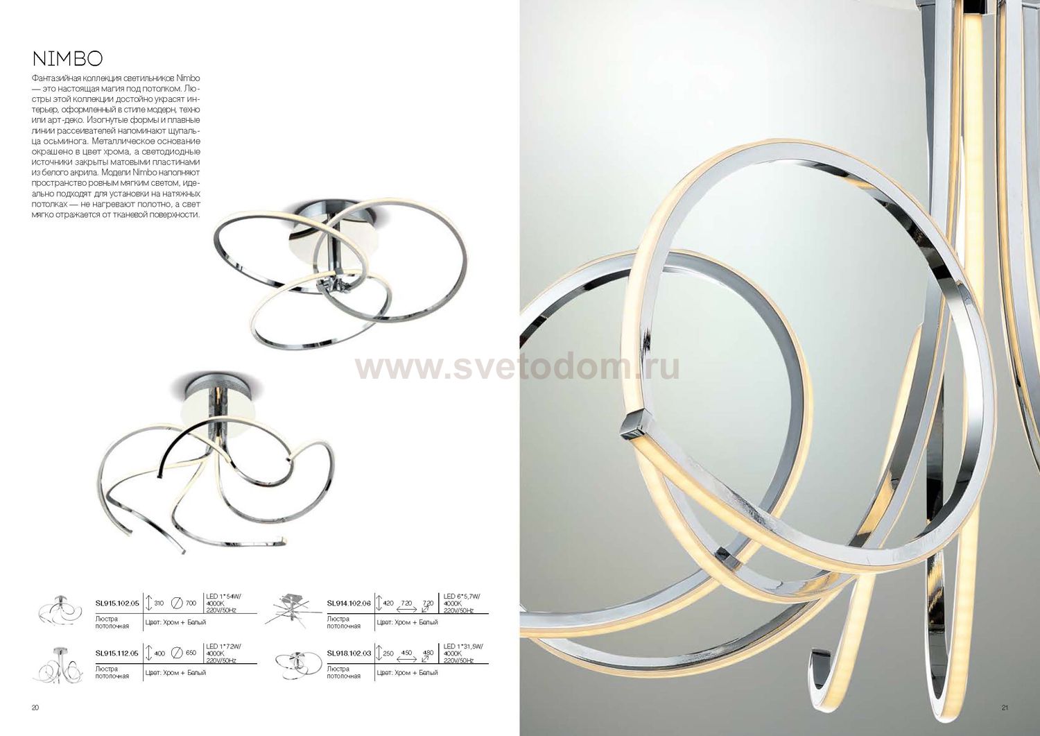 Если Вы настроены купить светильник модели SL91510205, то обратите внимание: Фантазийная коллекция светильников Nimbo - это настоящая магия под потолком. Люстры этой коллекции достойно украсят интерьер, офлрмленный в стиле модерн, техно или арт- деко. Изогнутые формы и плавные линии рассеивателей напоминают щупальца осьминога. Металлическое основание окрашено в цвет хрома, а светодиодные источники закрыты матовыми пластинами из белого акрила. Модели Nimbo наполняют пространство ровным мягким светом, идеально подходят для установки на натяжных потолках – не нагревают полотно, а свет мягко отражается от тканевой поверхности.