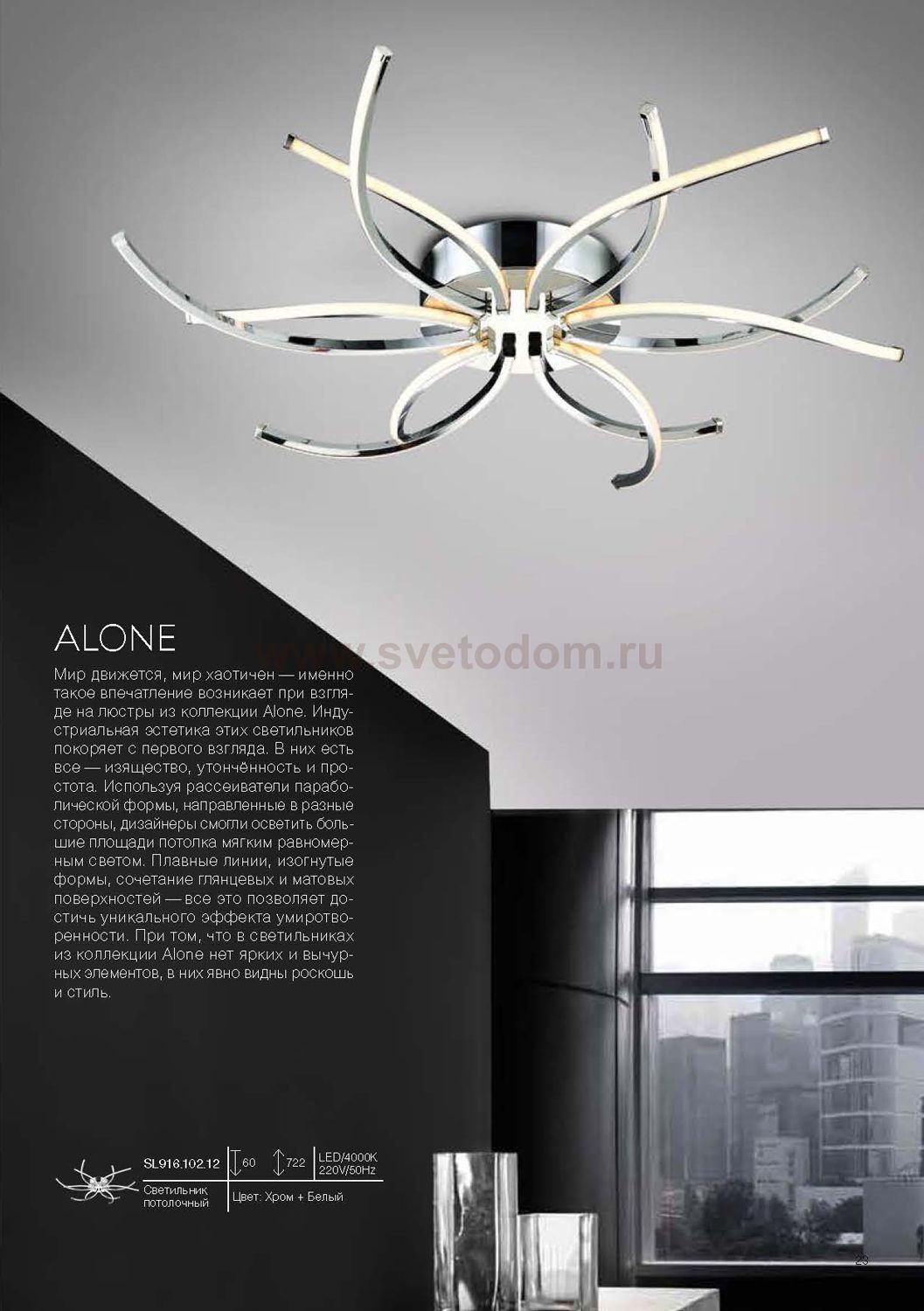 Если Вы настроены купить светильник модели SL91610212, то обратите внимание: Мир движется и он хаотичен - именно такое первое впечатление создается от люстры из коллекции Alone. Индустриальная эстетика этих светильников покоряет с первого взгляда. В них есть все - изящество, утончённость и простота. Используя рассеиватели параболической формы, направленные в разные стороны, дизайнеры смогли осветить большие площади потолка мягким равномерным светом. Плавные линии, изогнутые формы, сочетание глянцевых и матовых поверхностей - все это позволяет достичь уникального эффекта умиротворенности. При том, что светильники из коллекции Alone не обладают яркими,вычурными элементами, в них сохраняется ощущение роскоши и стиля.