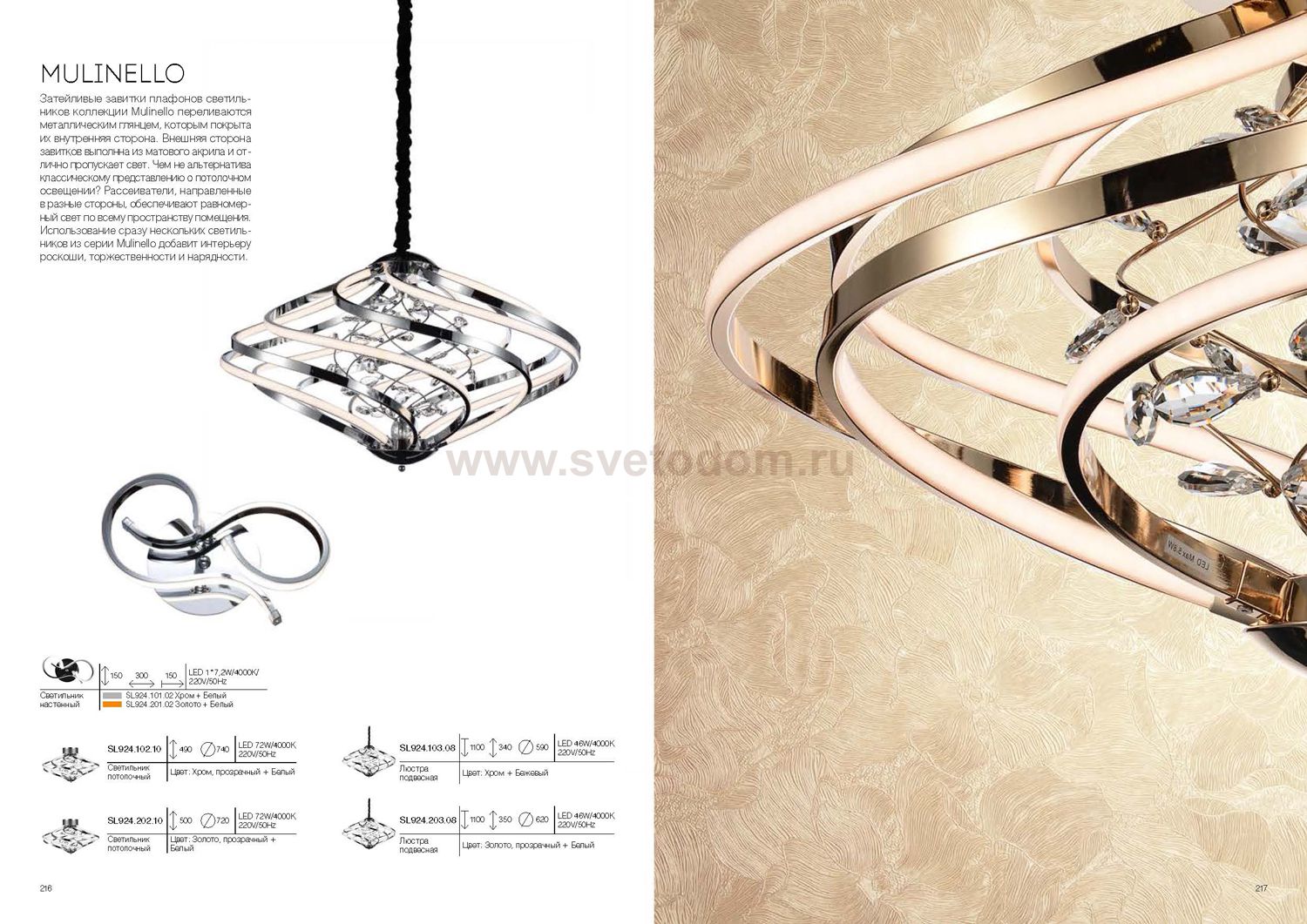 Если Вы настроены купить светильник модели SL92410102, то обратите внимание: Затейливые завитки плафонов светильников коллекции Mulinello переливаются металлическим глянцем, которым покрыта их внутренняя сторона. Внешняя сторона завитков выполнна из матового акрила и отлично пропускает свет. Чем не альтернатива классическому представлению о потолочном освещении? Рассеиватели, направленные в разные стороны, обеспечивают равномерный свет по всему пространству помещения. Использование сразу нескольких светильников из серии Mulinello добавит интерьеру роскоши, торжественности и нарядности.
