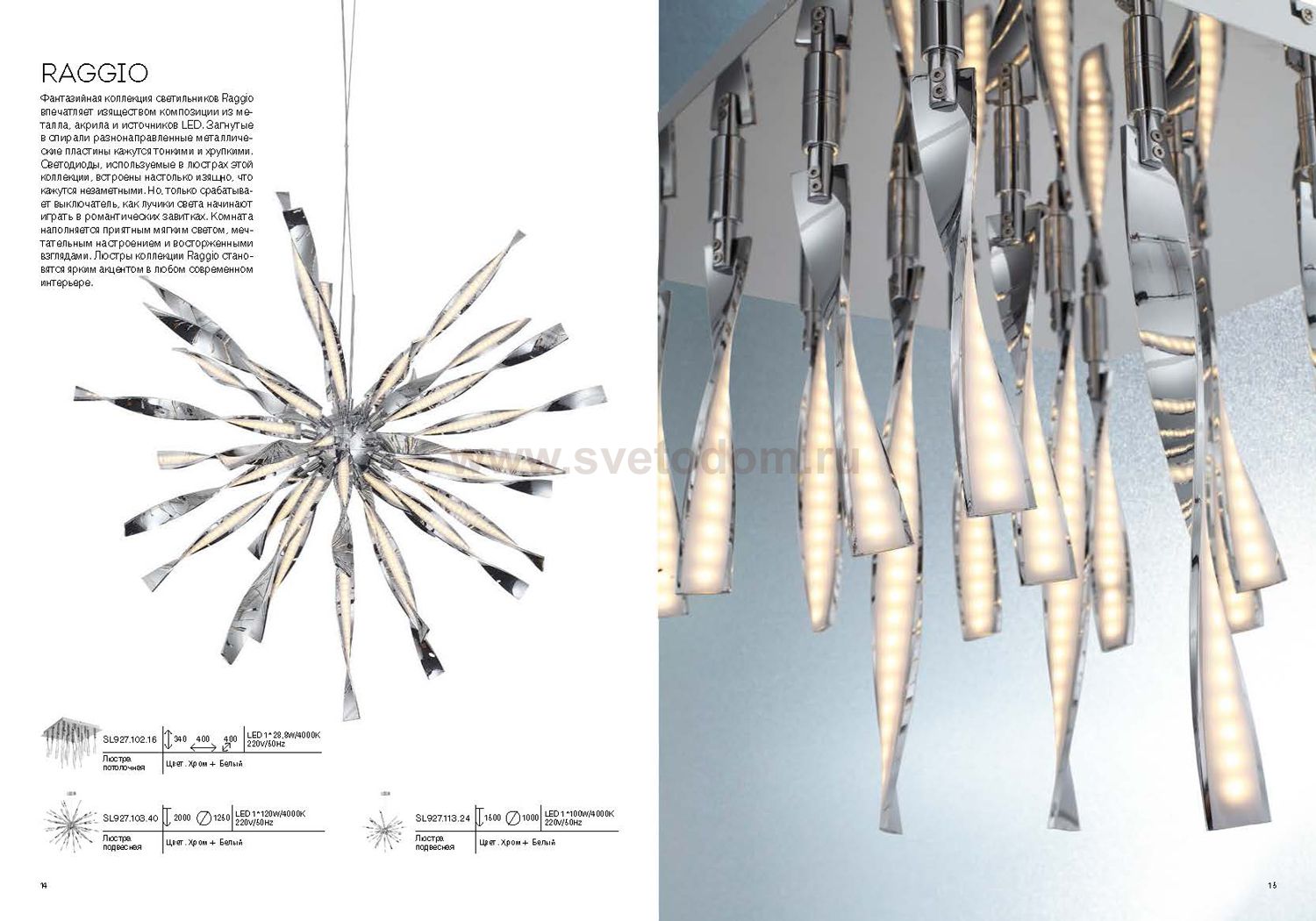 Если Вы настроены купить светильник модели SL92711324, то обратите внимание: Фантазийная коллекция светильников Raggio впечатляет изяществом композиции из металла , акрила и источников LED . Загнутые в спирали разнонаправленные металлические пластины кажутся тонкими и хрупкими. Светодиоды, используемые в люстрах этой коллекции, встроены настолько изящно, что кажутся незаметными. Но, только срабатывает выключатель, как лучики света начинают играть в романтических завитках. Комната наполняется приятным мягким светом, мечтательным настроением и восторженными взглядами . Люстры коллекции Raggio становятся ярким акцентом в любом современном интерьере.