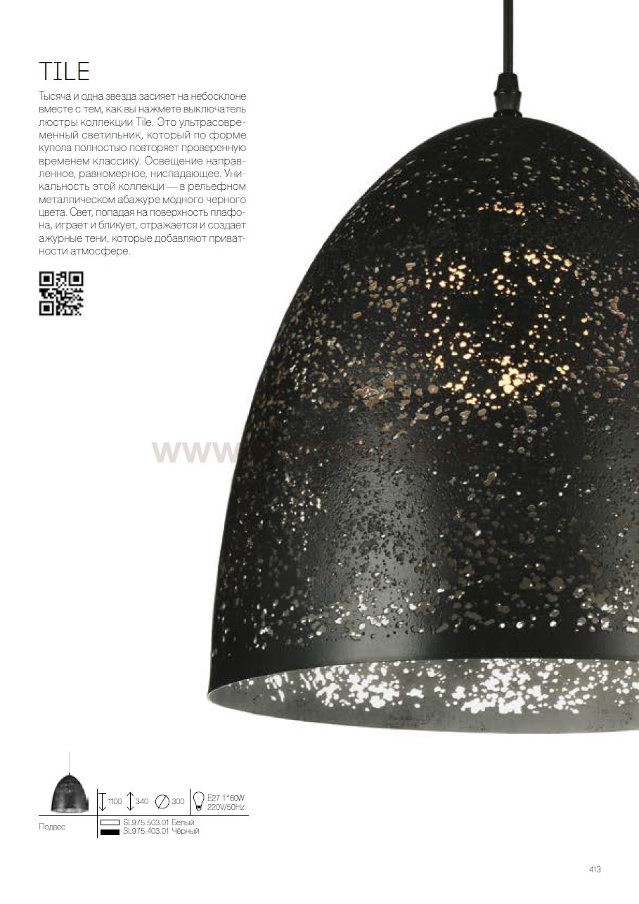 Если Вы настроены купить светильник модели SL97530301, то обратите внимание: Тысяча и одна звезда засияет на небосклоне вместе с тем, как вы нажмёте выключатель люстры коллекции Tile. Это ультрасовременный светильник, который по форме купола полностью повторяет проверенную временем классику. Освещение направленное, равномерное, ниспадающее. Уникальность этой коллекци – в рельефном металлическом абажуре гламурного черного цвета. Свет, попадая на поверхность плафона играет и бликует , отражается и создает ажурные тени, которые только добавляют приватности атмосфере.