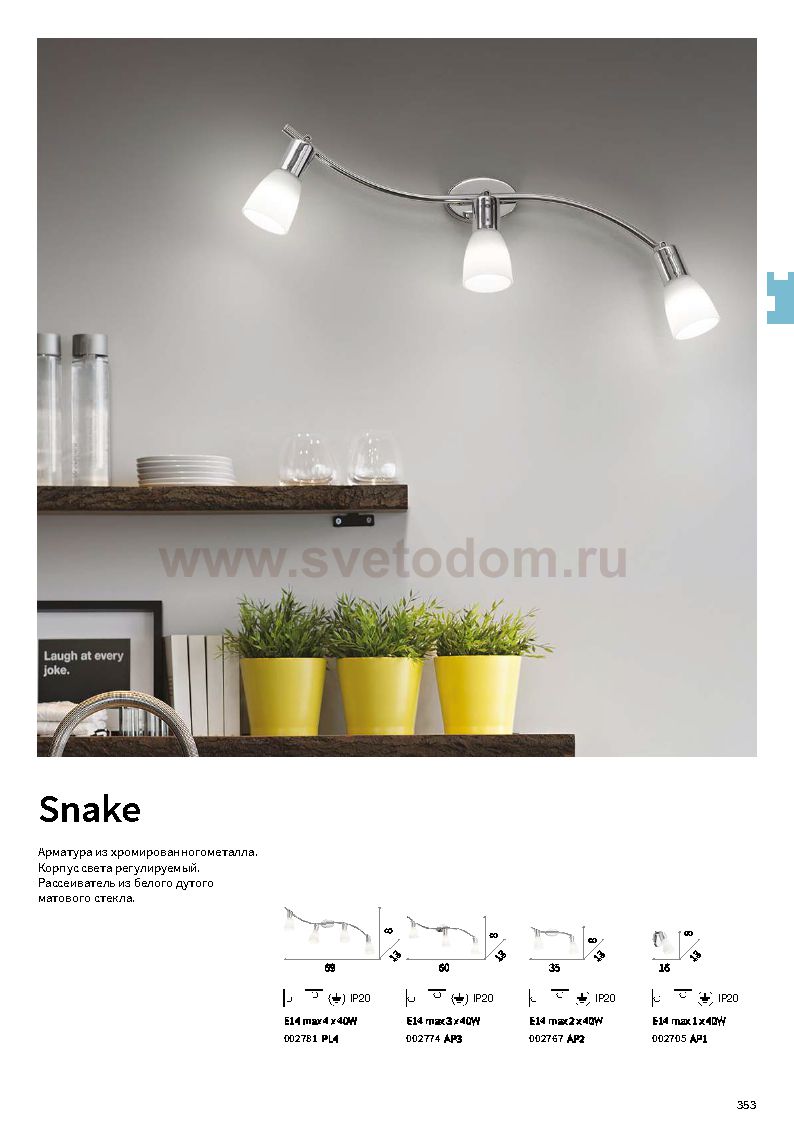 Светильники-споты – это оригинальные изделия с современным дизайном. Они позволяют не ограничивать свою фантазию при выборе освещения для интерьера. Такие модели обеспечивают достаточно качественный свет. Благодаря компактным размерам Вы можете использовать несколько спотов для одного помещения. Интернет-магазин «Светодом» предлагает необычный светильник-спот Ideal lux SNAKE PL4 по привлекательной цене. Эта модель станет отличным дополнением к люстре, выполненной в том же стиле. Перед оформлением заказа изучите характеристики изделия. Купить светильник-спот Ideal lux SNAKE PL4 в нашем онлайн-магазине Вы можете либо с помощью формы на сайте, либо по указанным выше телефонам. Обратите внимание, что у нас склады не только в Москве и Екатеринбурге, но и других городах России.