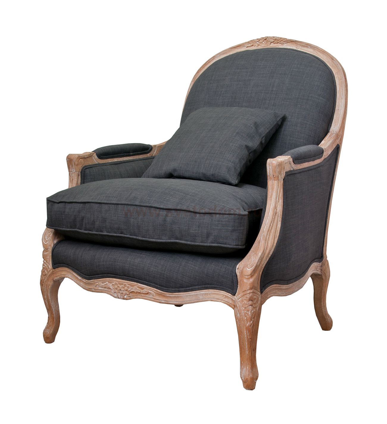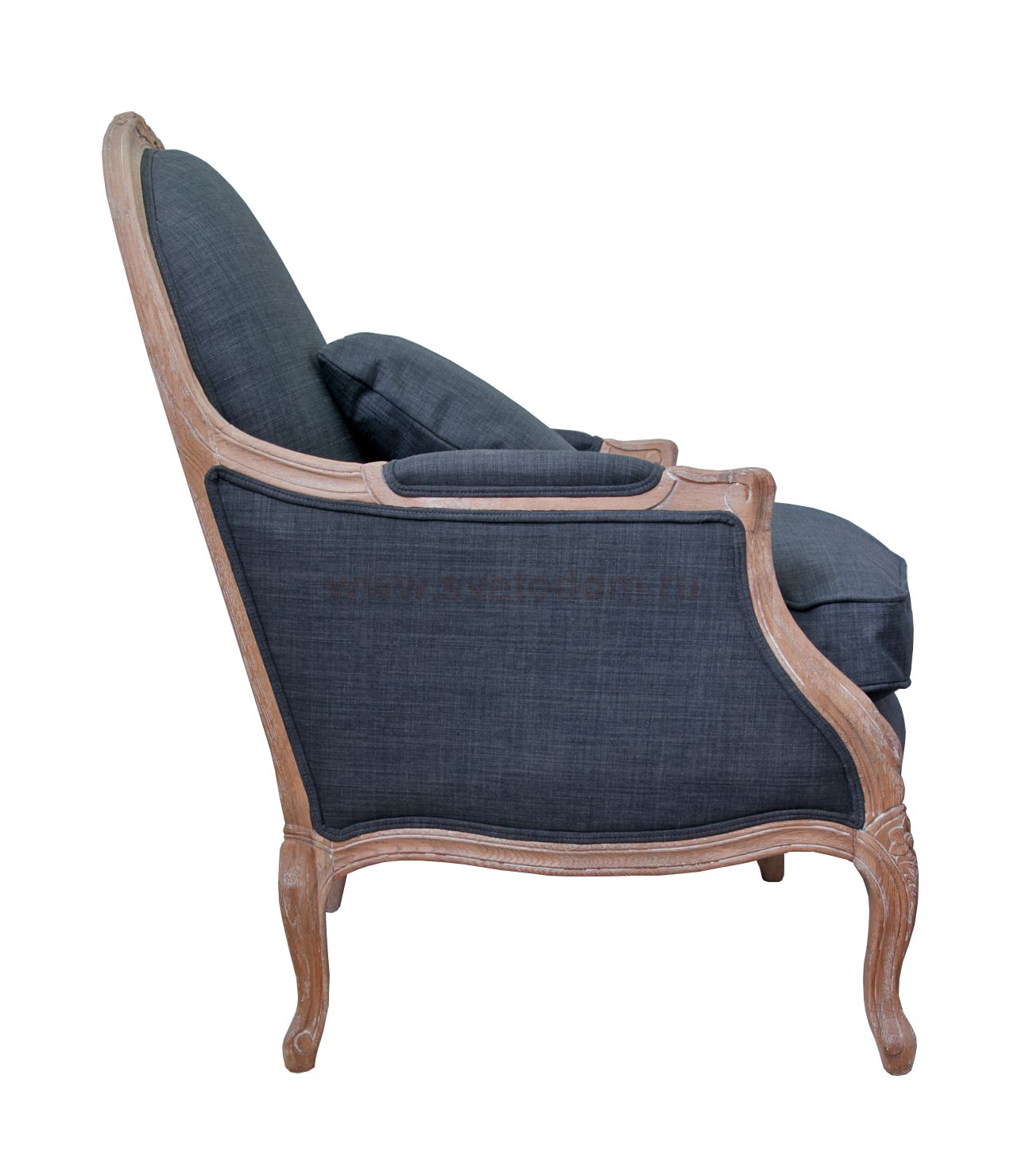 Светлая деревянная окантовка по периметру украшена узорами и приятно контрастирует с темно-серой льняной обивкой. Мягкие валики на подлокотниках обеспечивают удобное положение рук.
