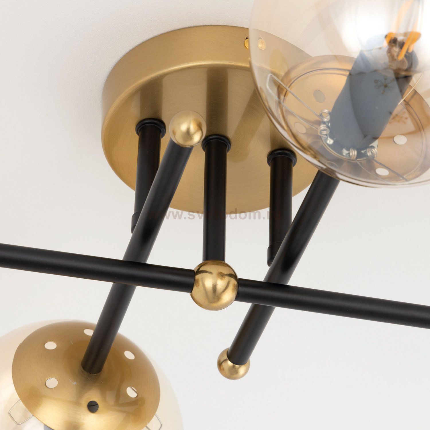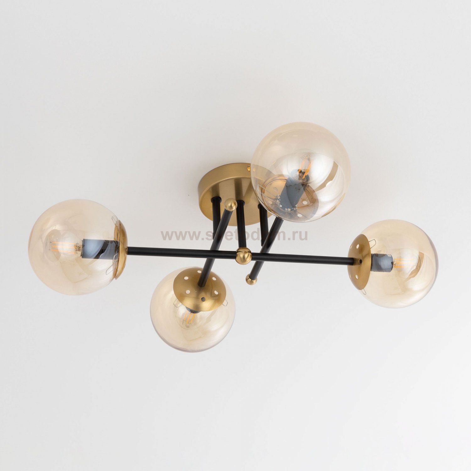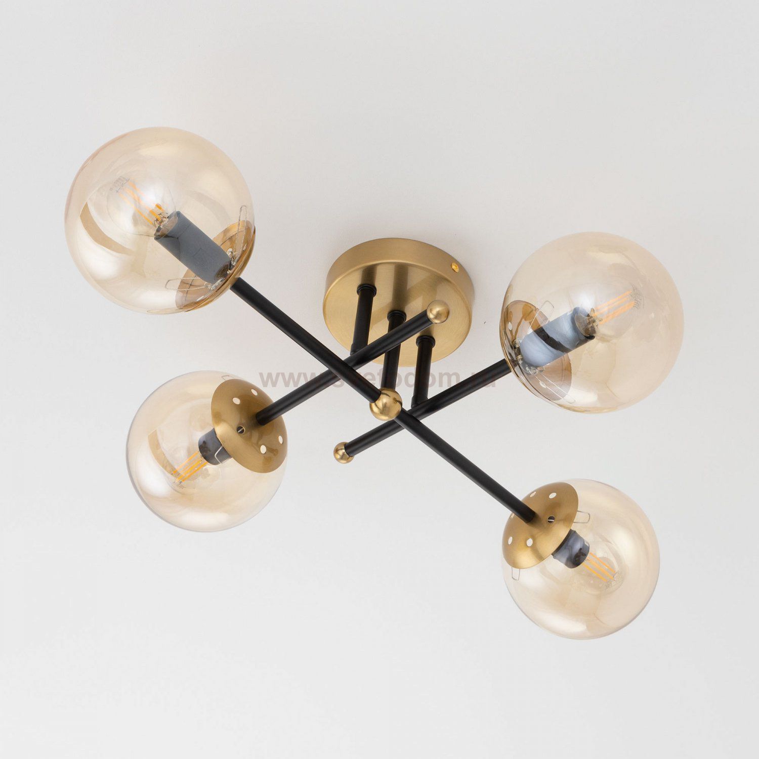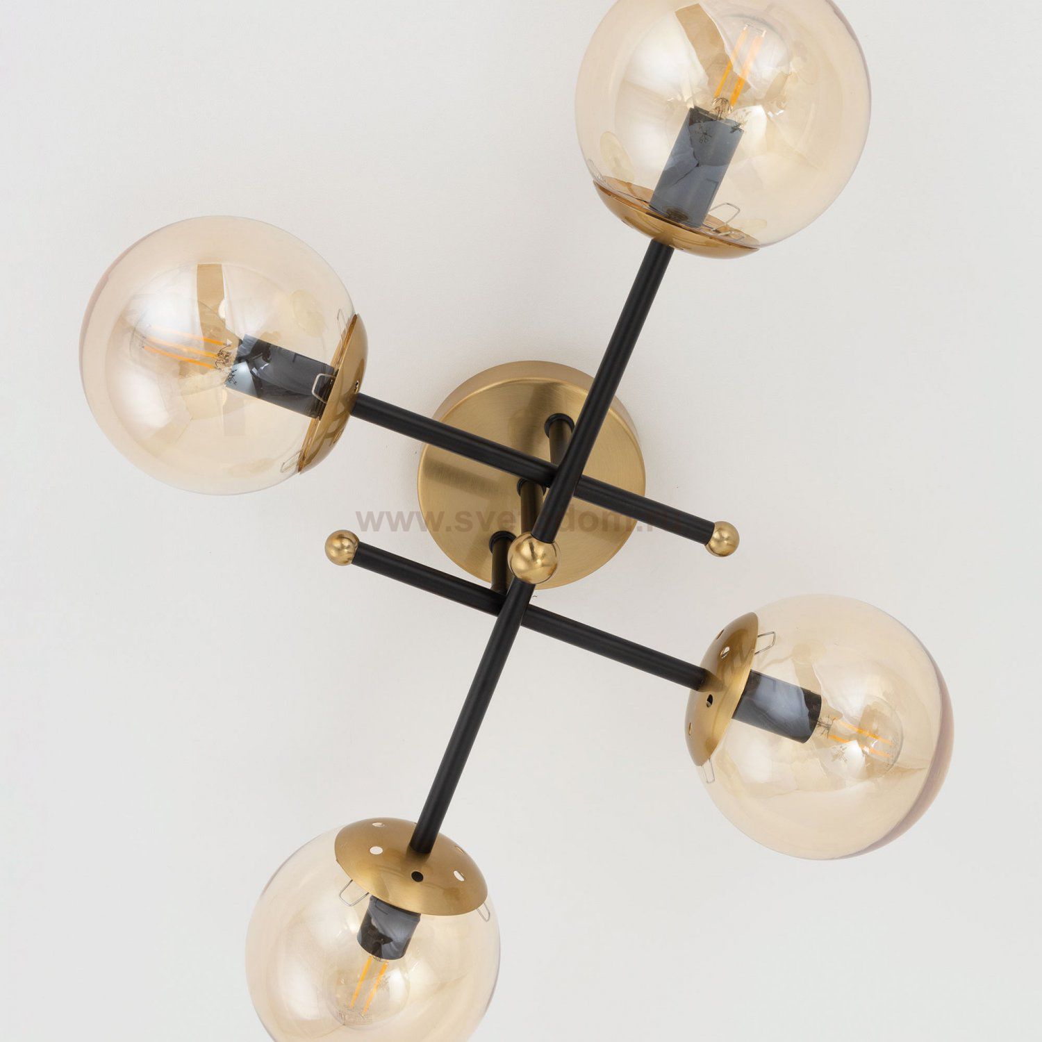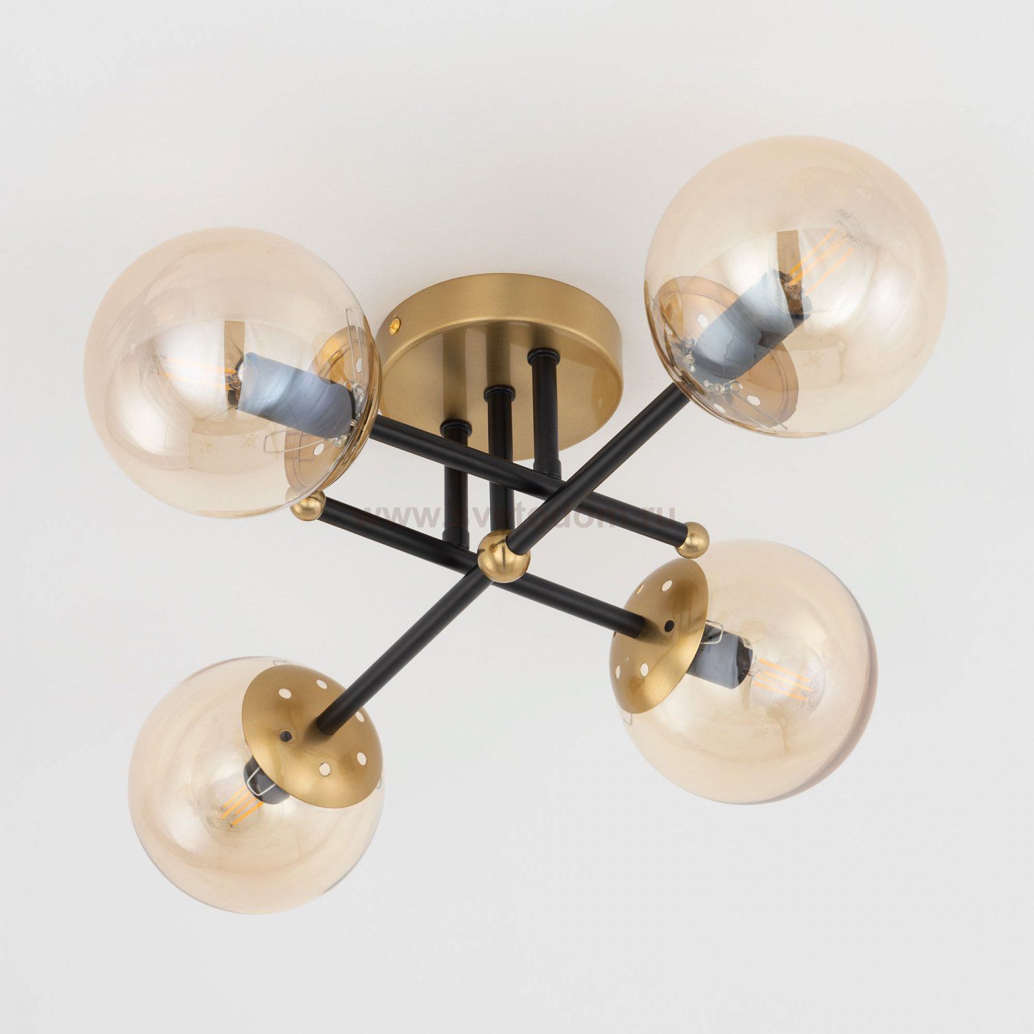 Стильная потолочная люстра Citilux Памела CL144145 для модных интерьеров, оформленных в стиле сканди, модерн или лофт. Корпус светильника металлический, цвет – сочетание чёрного и бронзы. Основание круглое, рожки-штанги расположены параллельно потолку. Плафоны в форме шара, изготовлены из прозрачного стекла светло-янтарного оттенка. В изделии используются 4 лампы с цоколем Е14, максимальной мощностью для ламп накаливания 40Вт. Светодиодные лампы можно устанавливать более яркие. Подходит для всех типов потолков, в том числе натяжных, тип крепления – планка.