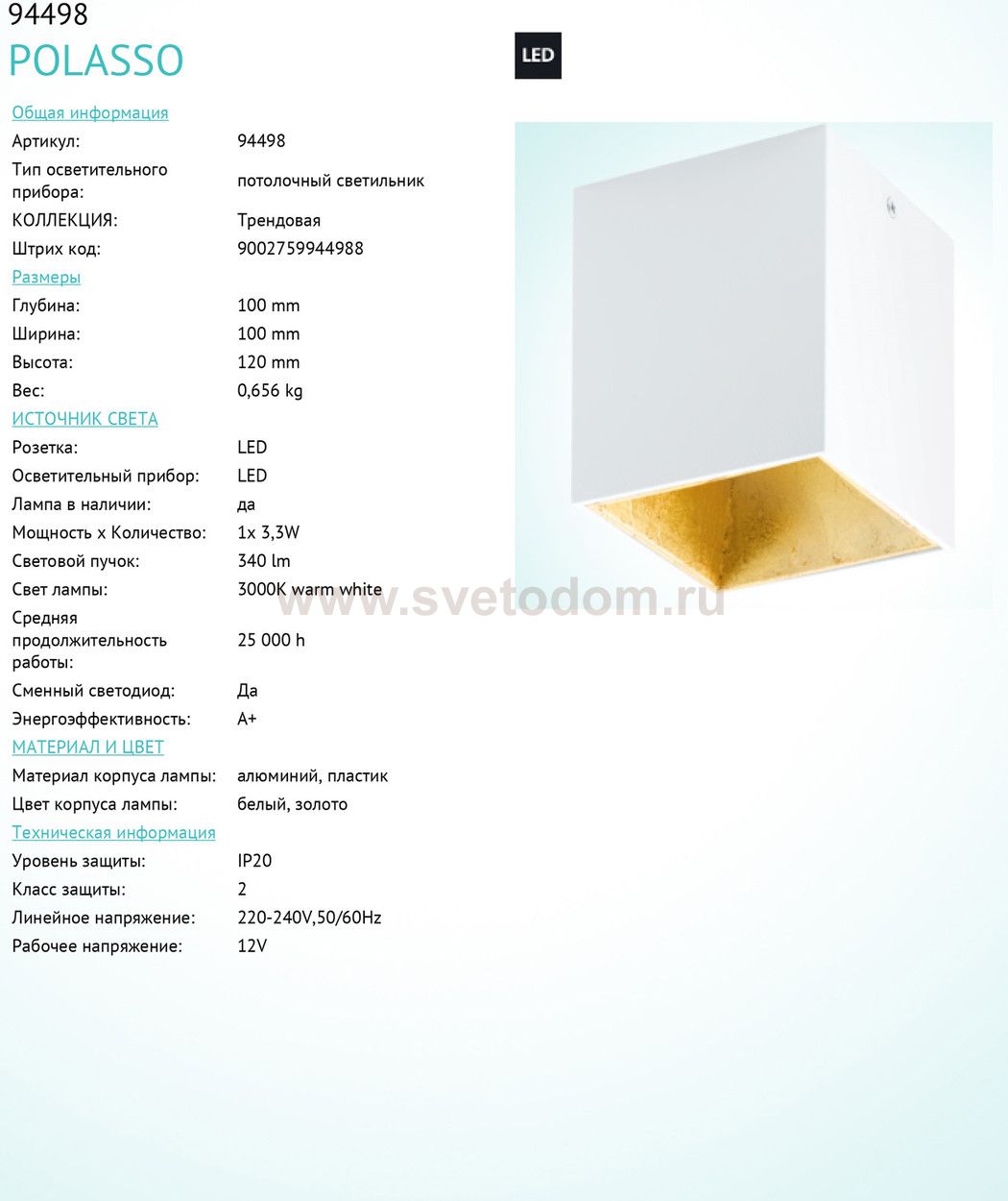 156 Отзывы Настенно-потолочный светильник Eglo 94498 POLASSOПока нет отзывов об этом товаре, напишите и он обязательно появится после модерации! Оставить свой отзывПохожие товары Другие товары магазина Фото