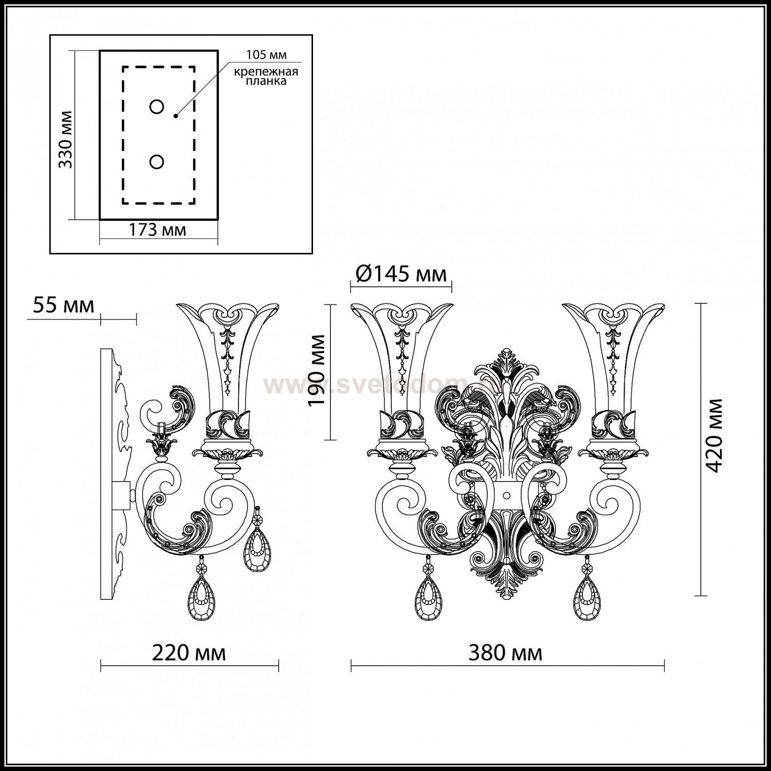 Бра 2431 / 2W линии Ponga покрыто бронзовым цветом, основание бра украшено лепниной, хрустальными подвесками высшего качества, матовый плафон из стекла молочного цвета по кромке декорирован изящным узором. Бра украсит любой интерьер и будет смотреться поистине роскошно и по - королевски. Цоколь E14. Мощность 2*60W. Нет ламп в комплекте.