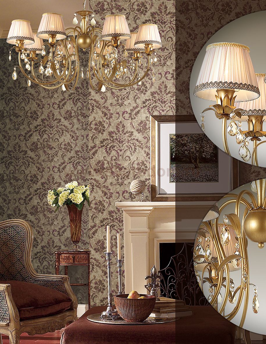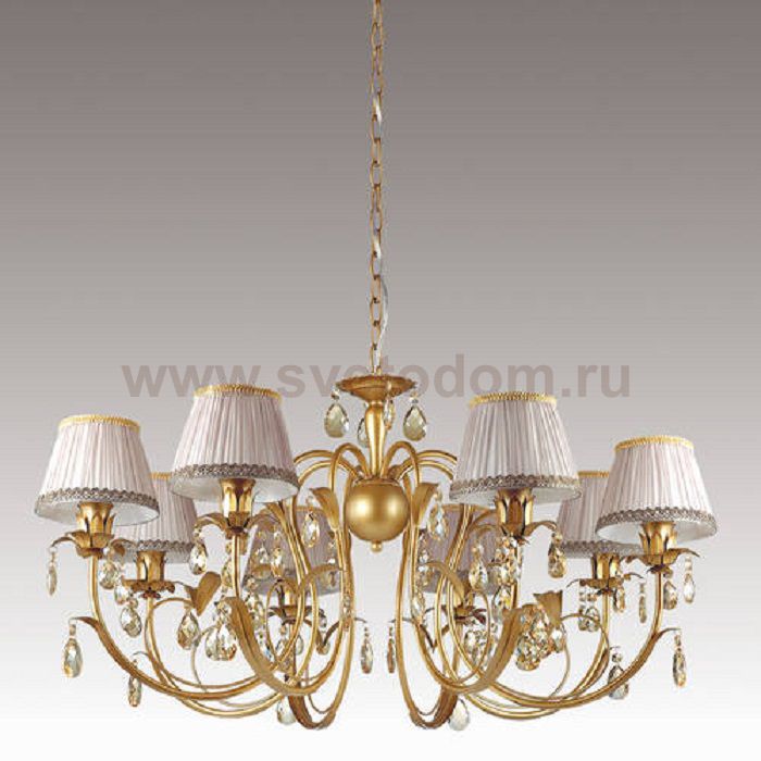 Люстра 3398 / 8 линии Carolla оформлена в классическом стиле. Люстра состоит из металлической арматуры цвета "матовое золото", с декоративным металлическим шаром в центре и красиво изогнутыми рожками в виде спускающихся вниз длинных тонких листьев, с которых свисают хрустальные крупные капли. Цоколь выполнен в виде множества распускающихся лепестков. Абажуры из тонкой полупрозрачной ткани цвета пыльной розы, которые придадут интерьеру чувство мягкости, свежести и безмятежности. Цоколь E14. Мощность 8*40W. Нет ламп в комплекте.