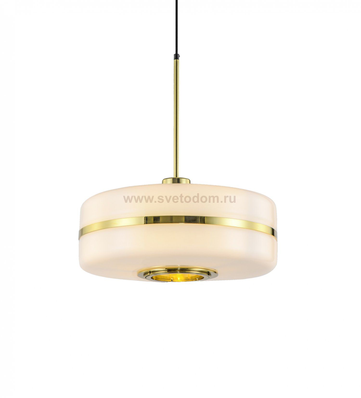 Люстра UFO 300 выполнена в форме диска, напоминающего летающую тарелку. Плафон изготовлен из матового стекла, полностью закрыт в верхней части и украшен по центру золотой полоской. Отверстие снизу с золотой каймой задает направление световому потоку и одновременно служит эффектным элементом декора.