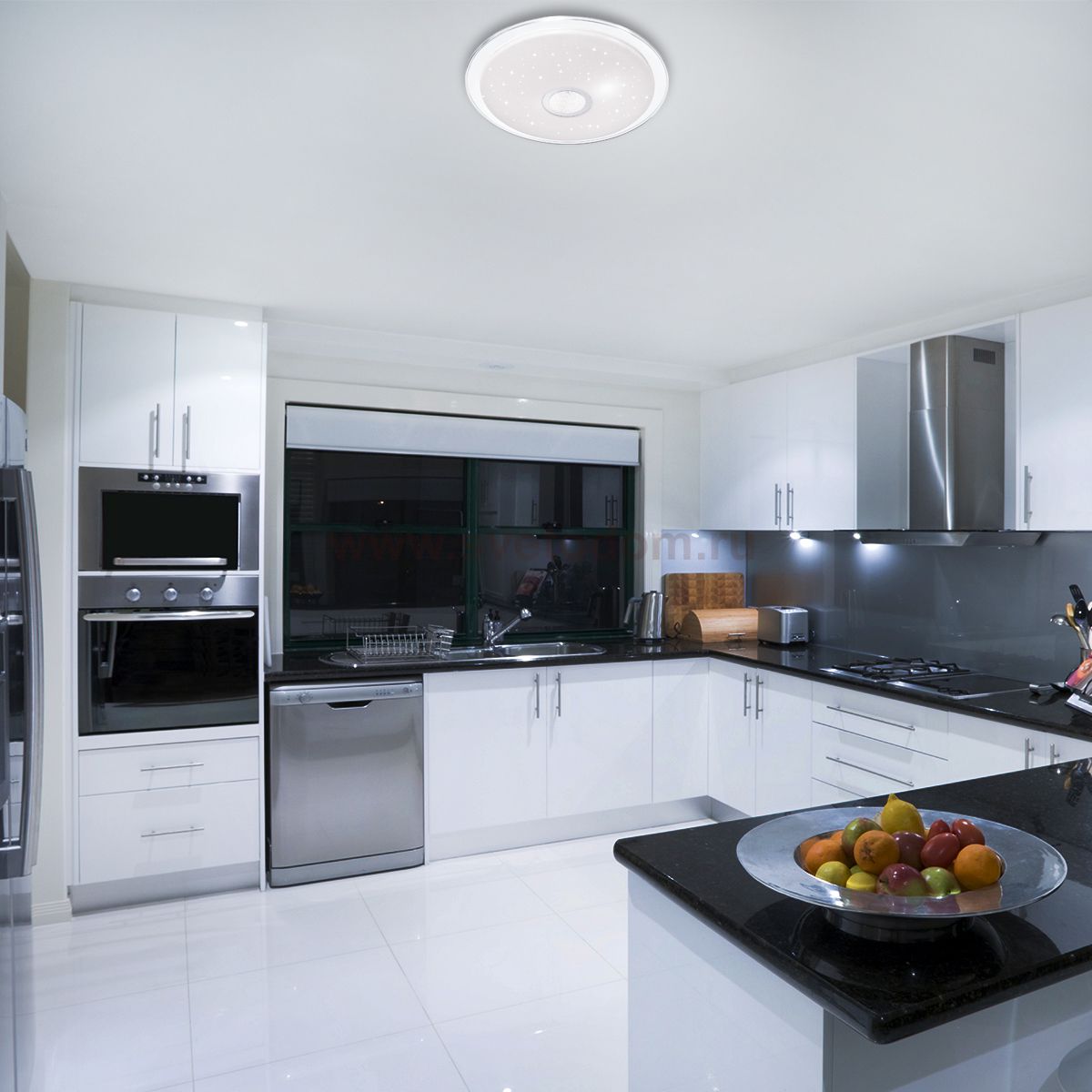 Светильник 2054 / / DL линии GALEO состоит из металлического основания (базы) и пластикового рассеивателя. Материал рассеивателя - высококачественный акрил белого цвета с глянцевой поверхностью, обеспечивающий светильнику равномерное рассеивание и хорошее светопропускание. Форма плафона: круглая, декорирована прозрачной рамкой, центральной вставкой с эффектом переливания и кантом цвета хром, а также прозрачными точками, придающими включенному светильнику красивый эффект "звездного мерцания". Степень защиты IP43 позволяет использовать светильник в определенных зонах влажных помещений. В комплект входит заменяемый LED модуль с линзами, мощностью 48Вт, которая соответствует лампе накаливания 350Вт. А также пульт ДУ, с помощью которого осуществляется плавное изменение цветовой температуры 3000 - 6000К, изменение яркости, переход в режим переключения теплого / белого / холодного / ночного света. Светильник имеет функцию "память".