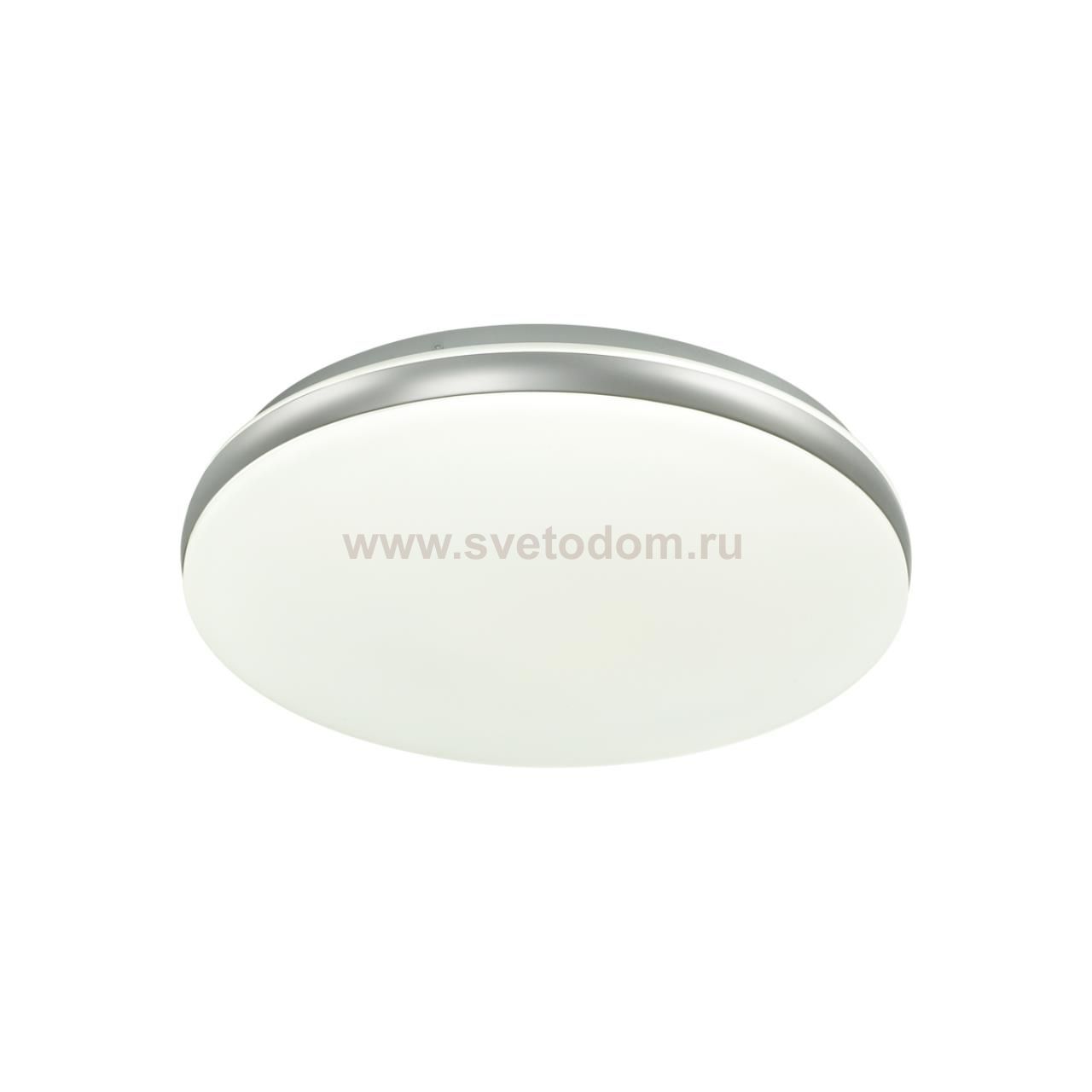 Светильник 7625/EL линии RINGO состоит из металлического основания (базы) и пластикового рассеивателя. Материал рассеивателя - высококачественный пластик марки PMMA 2.0 белого цвета с матовой поверхностью, без текстуры. Пластик обеспечивает светильнику равномерное рассеивание и хорошее светопропускание. Форма плафона: круглая, декорирована ободом из пластика серебристого цвета. Степень защиты IP43 позволяет использовать светильник в определенных зонах влажных помещений. В комплект входит заменяемый LED модуль с линзами, мощностью 72Вт, которая соответствует лампе накаливания 520Вт. А также пульт ДУ, с помощью которого осуществляется плавное изменение цветовой температуры 3000-6000К, изменение яркости, переход в режим переключения теплого/белого/холодного/ночного света. Светильник имеет функцию "память".